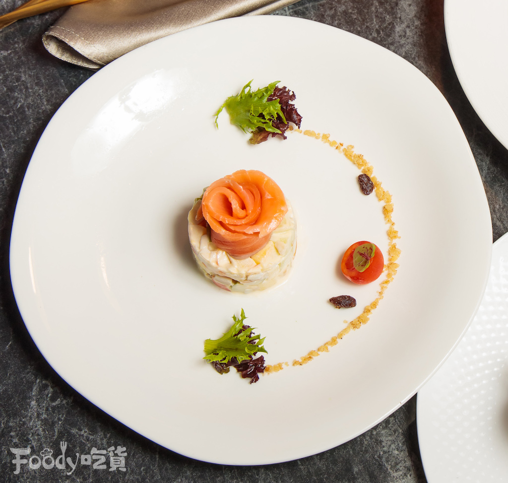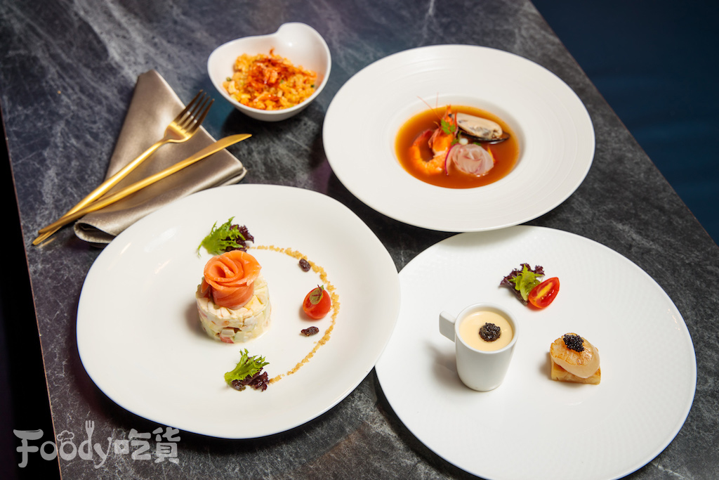 ▼一席美好的套餐,就從夏慕尼經典熱前菜與湯品開始。主廚嚴選魚子醬干貝、滑嫩中帶有松露鮮香的松露蒸蛋,搭配多種海鮮與蔬菜烹調而成的海鮮清湯與湯碗中做成玫瑰花造型的鯛魚,充分品嘗到海鮮鮮味,香氣十足。再來是擺盤細節精緻講究的燻鮭魚花爾道夫沙拉,玫瑰花造型的燻鮭魚充滿藝術感,優格與水果酸香微甜的風味,調和燻鮭魚濃郁鮮甜的香氣,吃起來清爽不膩,非常開胃。