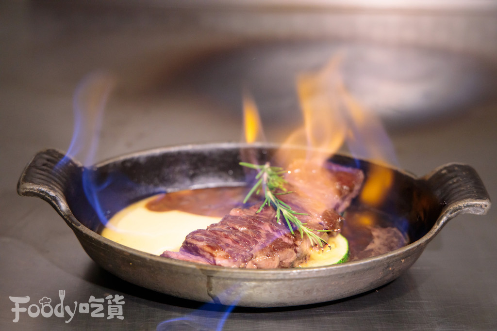 ▼經過香醇威士忌Flambé,將牛排肉汁以大火高溫鎖住,外表煎得焦香,肉質則在威士忌的作用下變得更加香嫩,酒精隨火焰揮發、留下濃郁酒香濃縮進牛排中,與肉汁一起在嘴裡流淌,讓人吃過就再也忘不了的美味。