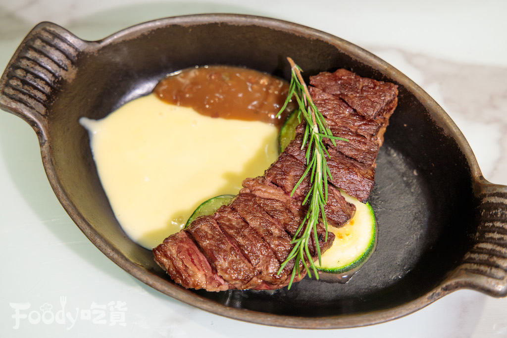 ▼重頭戲主餐,可選擇「威士忌烈焰牛排」,以百年酒廠威士忌炙燒,經典法式「Flambé」手法,可說是視覺、嗅覺加上味覺的豪華饗宴,也象徵情侶間的愛情像這牛排一樣火熱。