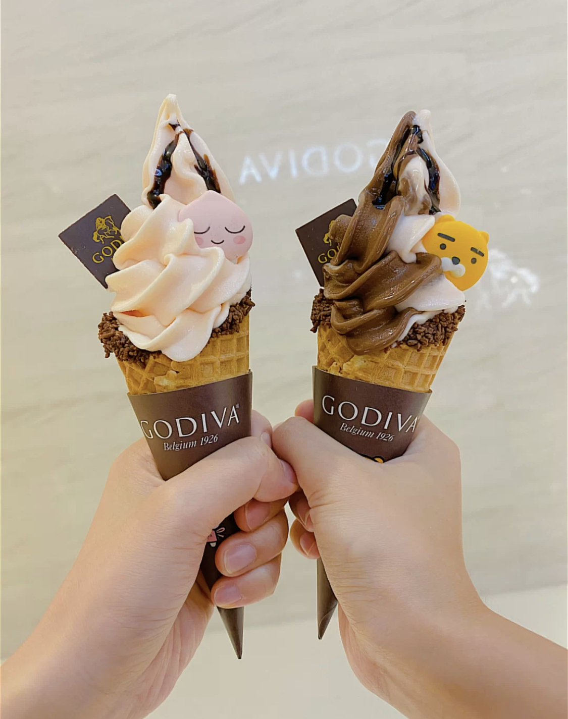 2020年08月18日高質感巧克力品牌Godiva又推出新品啦,這次和韓國人氣超高的 Kakao Friends聯名,推出期間限定霜淇淋、凍飲,可愛的萊恩和屁桃除現在Godiva經典雙淇淋上,萌萌的模樣讓人捨不得咬下去呀~~