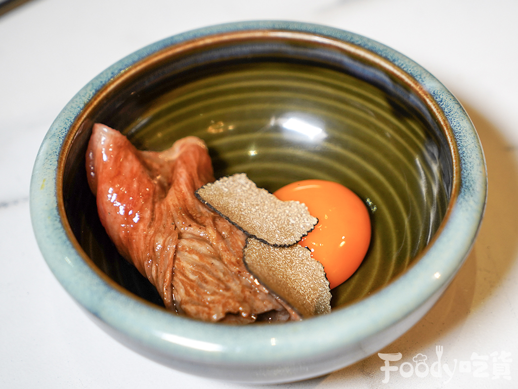 ▼最優秀賞A5等級、BMS達12的姬路和牛厚切牛排,外皮微微焦脆,肉質呈現粉嫩五分熟,脂香肉嫩;北海道A5和牛薄切肋眼,刷秘製醬汁快速炙烤後,豪邁現刨法國黑松露,搭配佐有機土雞蛋黃享用軟嫩滑口的極致美味。