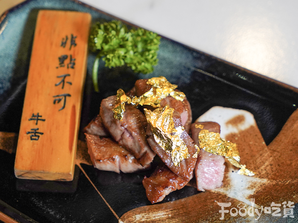 ▼肉品匯集日本第一松阪伊藤A5和牛、兵庫縣最優秀賞A5和牛、北海道A5和牛及澳洲9+等四產地和牛不同部位。澳洲9+和牛舌選用柔軟舌根部位厚切2公分,碳烤至表面金黃微焦,鋪上奢華的食用金箔象徵情比金堅,軟嫩帶有嚼勁,口口盡是滿足!