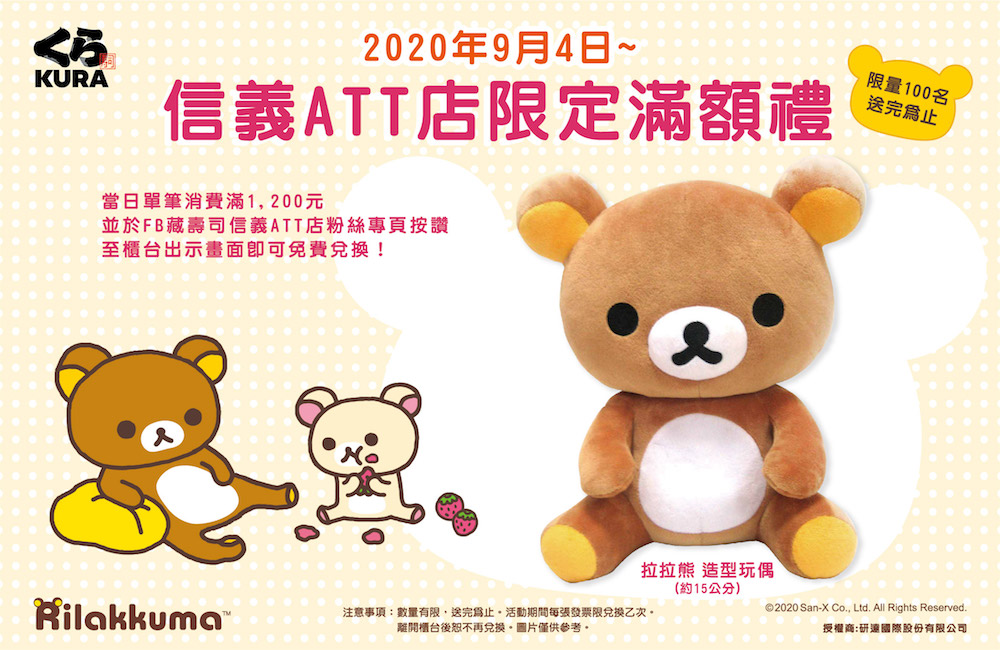 ▼繼藏壽司微風松高店開幕後,藏壽司正式宣布將於信義區再設據點,進駐ATT 4 FUN,8/21起享先試營運、8/28正式開幕,開幕期間8/21-9/3期間用餐參加FB活動可享9折優惠。信義ATT店則祭出萌度百分百的毛絨絨「拉拉熊造型玩偶」,最呆萌慵懶的神情要收服所有壽司控!當日單筆消費滿1200並於FB藏壽司信義ATT店粉絲專頁按讚,至櫃檯出示畫面即可兌換(限量100名)。