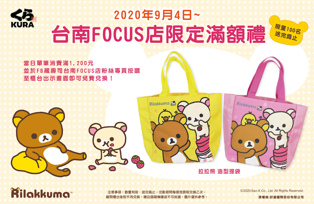 ▼台南人久等了!藏壽司台南首店選在距離台南車站僅有步行距離的Focus 時尚流行館,8/28起試營運、9/4正式開幕,開幕期間8/28-9/10用餐參加FB活動可享9折優惠。而台南FOCUS店限定的滿額禮,是超可愛的拉拉熊提袋,把懶萌拉拉熊隨身帶著走;當日單筆消費滿1200並於FB藏壽司台南FOCUS店粉絲專頁按讚,至櫃檯出示畫面即可兌換(限量100名)。