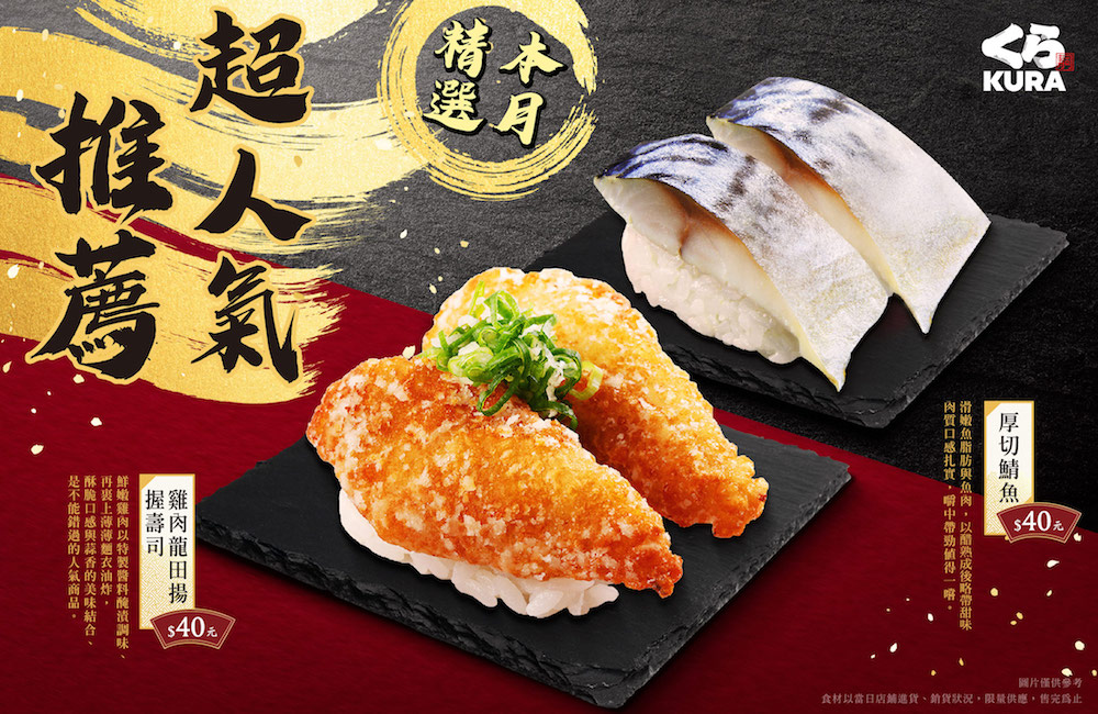 ▼此外,全台藏壽司也推出期間限定的8月嚴選料理,包含全新推出「雞肉龍田揚握壽司」,金黃酥脆外皮鎖住滿滿肉汁,肉控最愛!以及「厚切鯖魚」嚴選肉質肥厚紮實的鯖魚大塊厚切,甜味、鮮味十足。