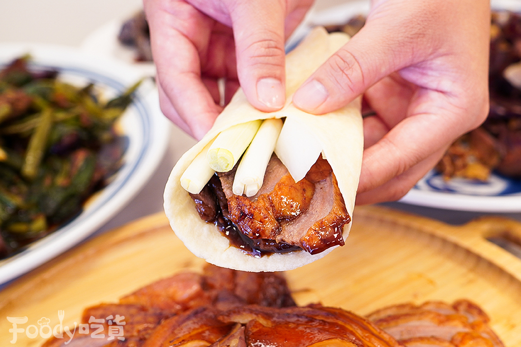 ▼吃烤鴨當然不能少了用餅皮包著吃,達人嗑鴨的烙餅都是現做現烤,餅皮偏厚、愛吃肉的人可以多包幾片肉也不會「露餡」XD。Q軟餅皮與香甜濃郁的甜麵醬、辛中帶甘的大蔥、酸甜美味的柚香蘿蔔,以及重頭戲香脆烤鴨一起品嚐,多層次口感跟香氣一次竄進嘴裡,實在太奢侈!