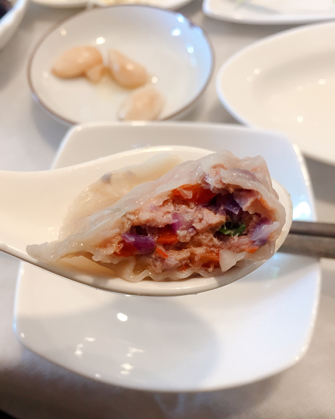 ▼說到「哈餃子」,到店裡必點的就是這盤「水晶七彩餃」,水晶七彩餃」的 餃子皮相當薄透,一份10顆餃子裡共有8種口味,內餡使用紅蘿蔔、芝麻、紫高麗、杏鮑菇、龍鬚菜、玉米、韭菜花、蒜苗、南瓜、彩椒等蔬菜製作,每一顆都能吃到不一樣的蔬菜,每口都有驚喜感~配上腰內肉包在一起,整體吃起來真的超滿足!