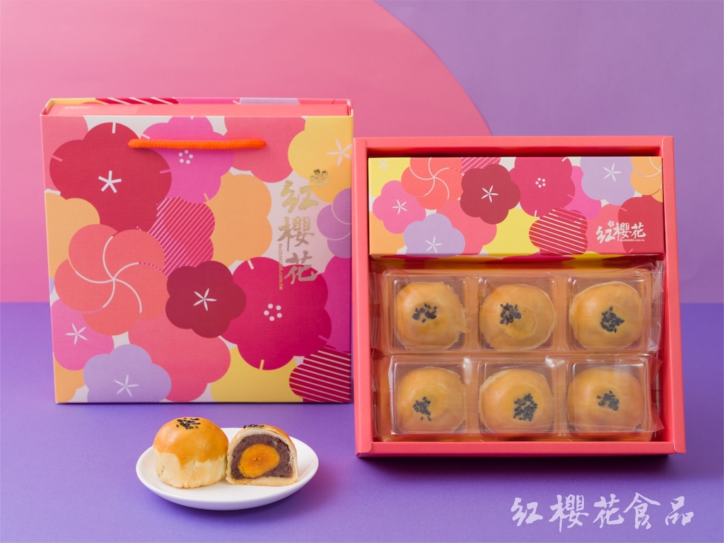 ▼除了可愛的蛋黃哥以外,紅櫻花熟蛋黃酥還有大器又優雅的櫻花款包裝,美美的提袋與外盒,裡面同樣裝著大顆飽滿的蛋黃酥,是拜訪長輩的送禮首選。