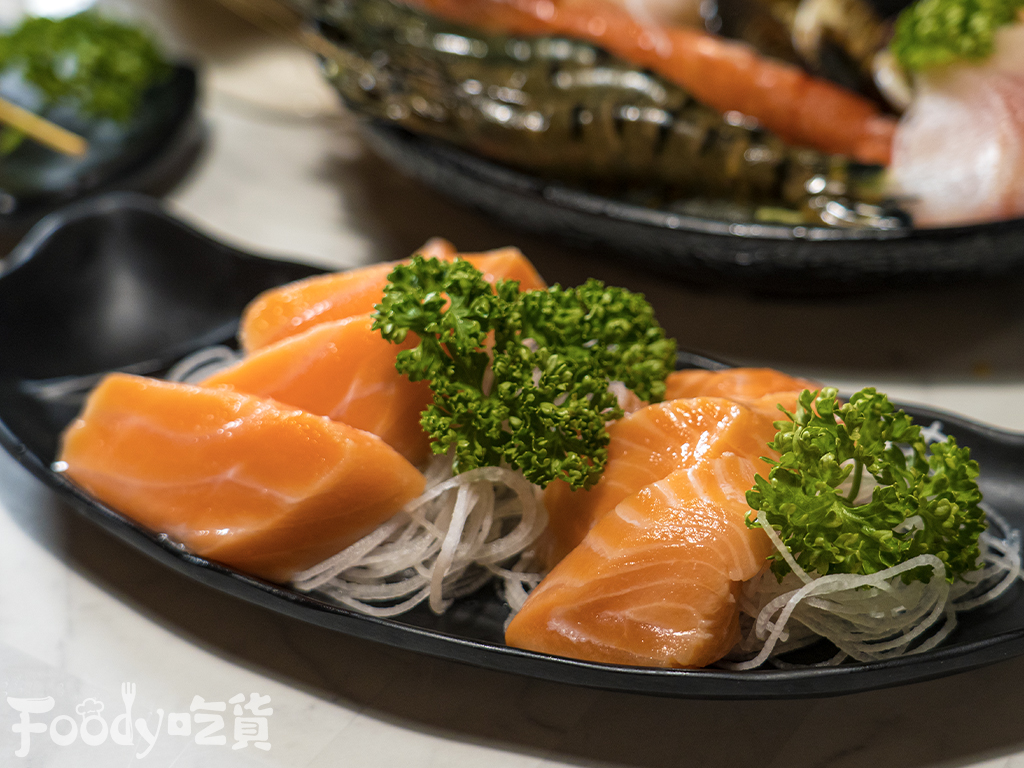 ▼吃完肉肉之後,火鍋的結尾當然要靠海鮮換換口味才行~「小海鮮拼盤B」不到250元就可以一次吃到干貝、紅蝦、蛤蠣、生白蝦、鯛魚、鮭魚六種高級海鮮!此外,在這裡也可以品嘗到壽司店等級的「生鮭魚切片」,七片厚實飽滿的鮭魚片只要180元,老闆在定價上根本佛心來著啊!!