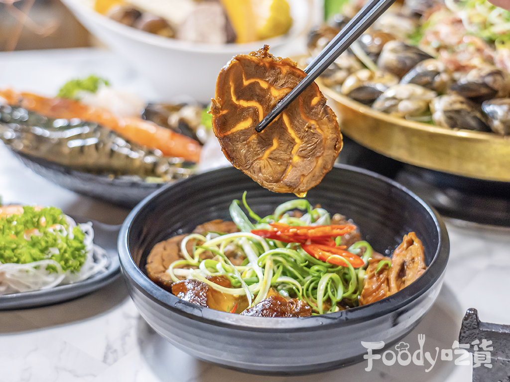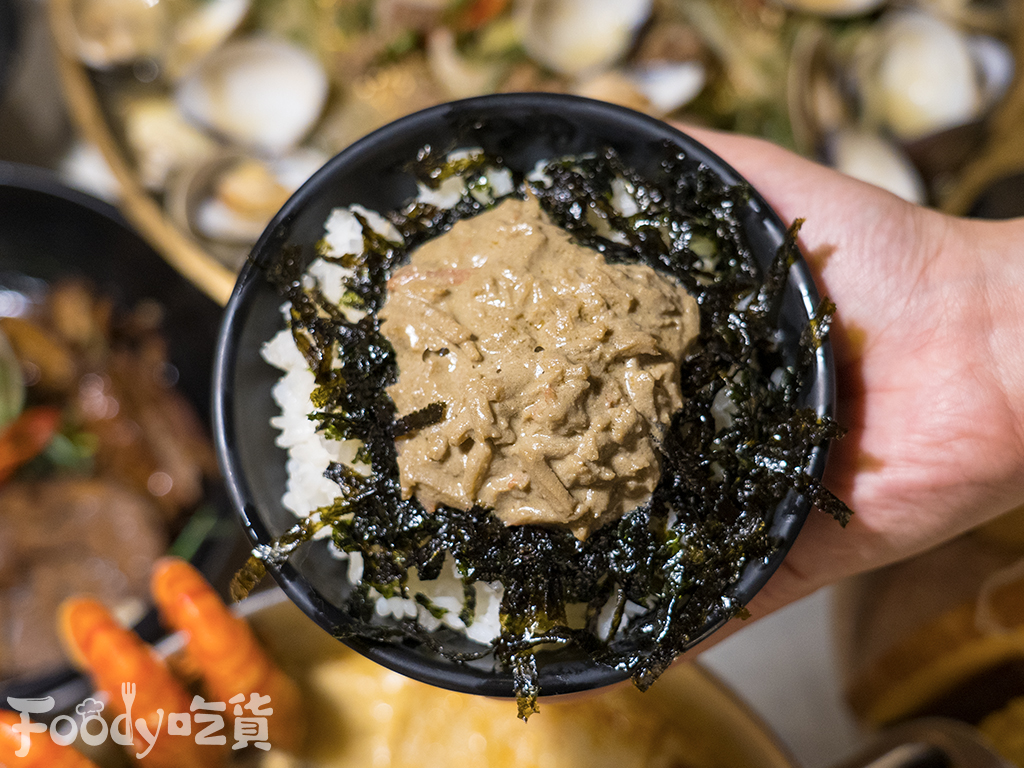 ▼除了鍋物、銅盤烤肉表現絕佳之外,就連小菜也不馬虎!像是這道「秘制滷牛肉」(NT$ 98)是老闆家傳20年的老味道,滷到入味的牛肉、甜鹹適中的醬汁,配上熱騰騰的白飯一起吃超對味!「蟹膏飯」(NT$ 88)一整球蟹膏直接擺在白飯上,搭配海苔絲攪拌之後,一口吃下滿滿螃蟹精華鮮味充斥整個口腔,實在是太幸福了~~