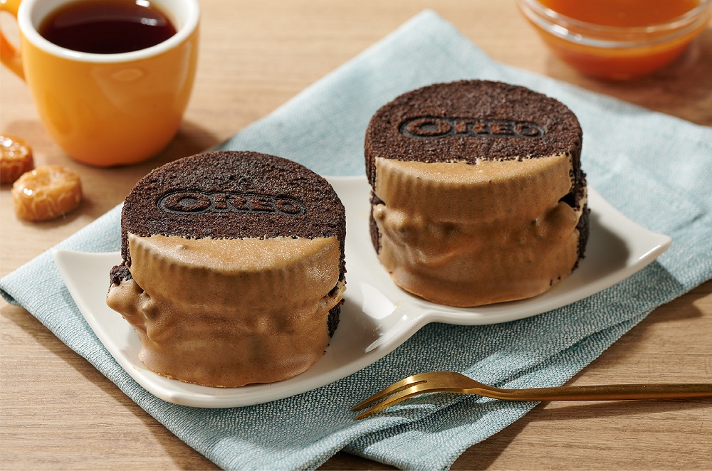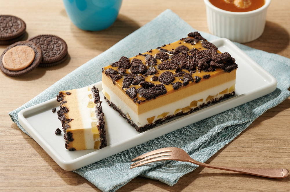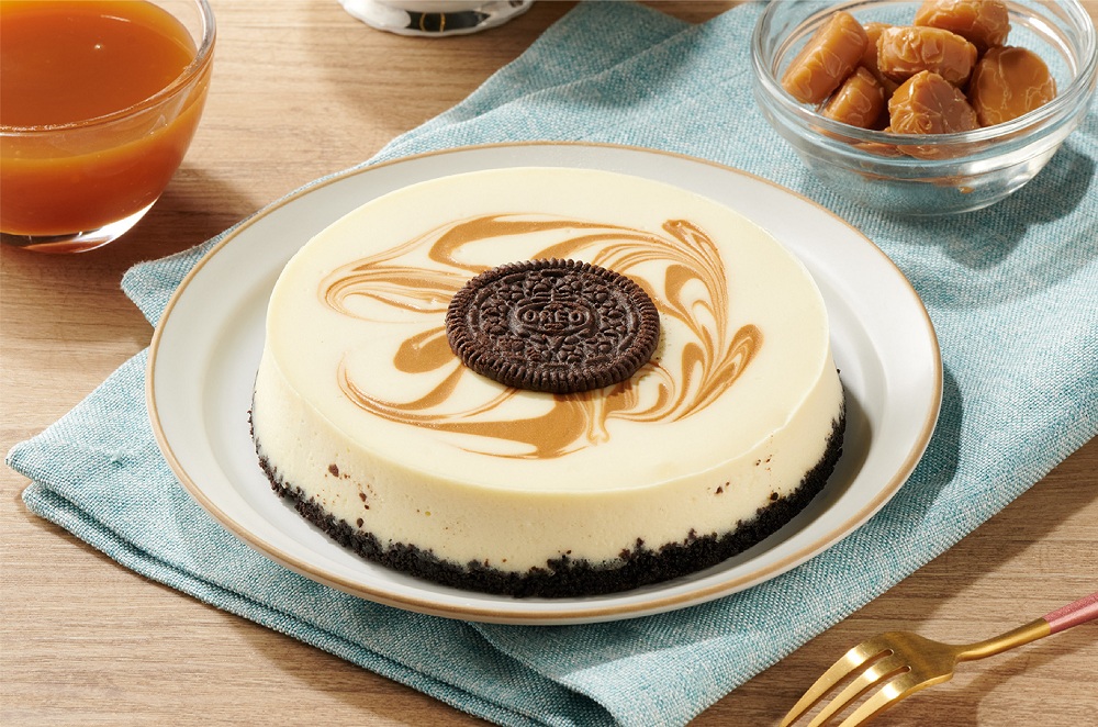 ▼「焦糖鹽之花乳酪」香濃厚實的乳香風味中,有著一抹純淨與清爽,巧妙運用鹽之花融合焦糖,鹹味圓潤輕柔,搭配OREO經典巧克力餅乾底層,優雅香甜、兼具創意。