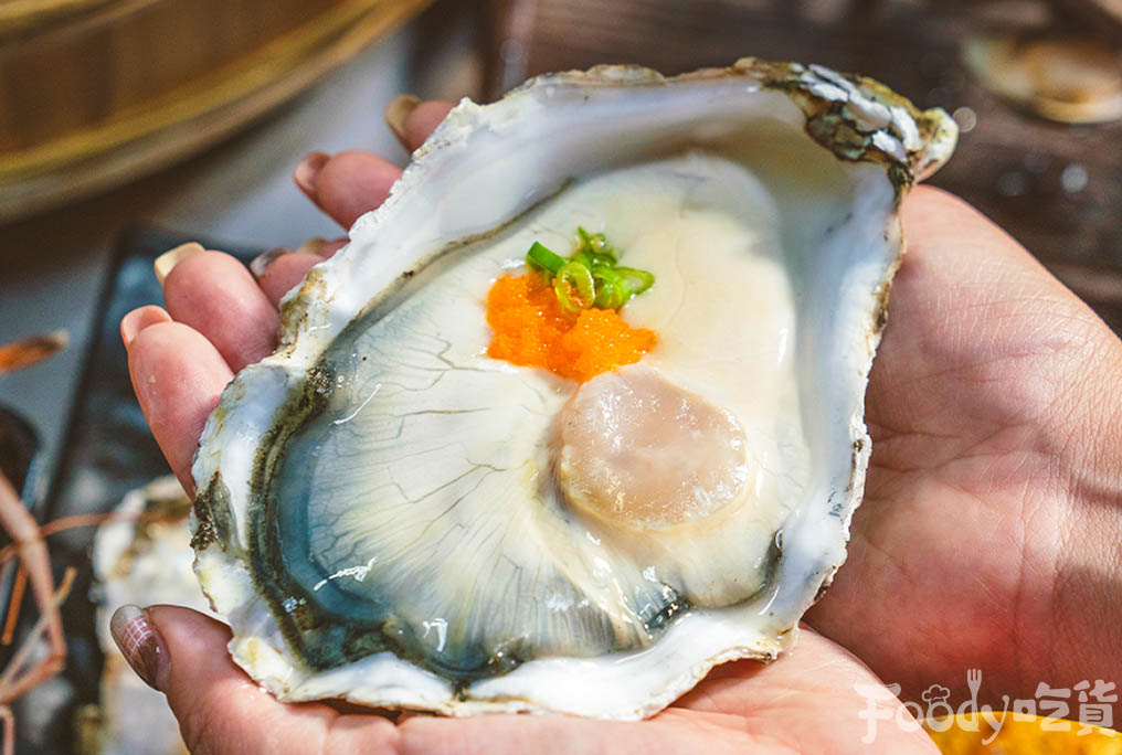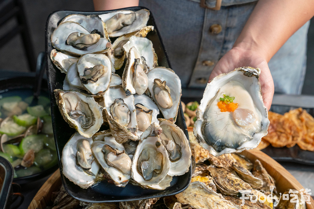 ▼除了鮮蚵外,愛吃生猛海鮮的人一定要點這道「美國大生蠔」,巨無霸的尺寸要兩隻手才捧得動,還能見到幾乎有硬幣大小的貝柱,點綴蝦卵提味,肥美的蚵肉入口後蚵膏在嘴裡噴出,充分品嘗到甜美而不腥的濃郁海味。