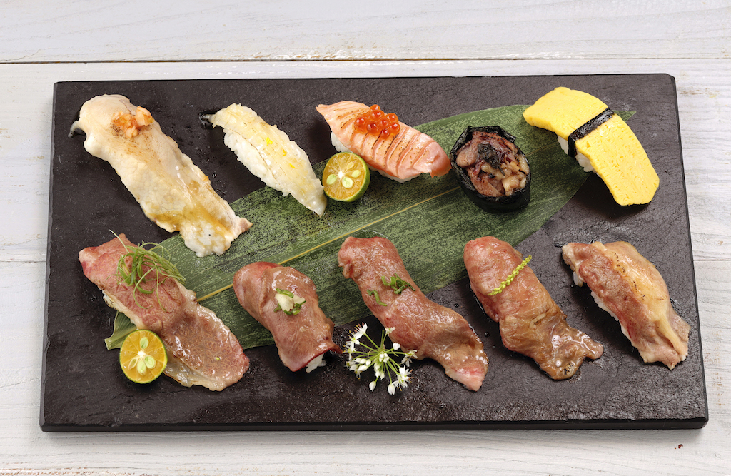 ▼燒肉及握壽司是日本最具代表的兩種美食,『鉄火燒肉微風台北車站店』滿足消費者想吃燒肉又想吃握壽司的慾望,『十貫握壽司拼盤』匯集日本A5和牛三品、和牛舌、櫻桃鴨、牛五花、豬五花、比目魚側邊肉、鮭魚、玉子燒等精選海陸食材,套餐定價498元,附湯品、生菜、漬物。