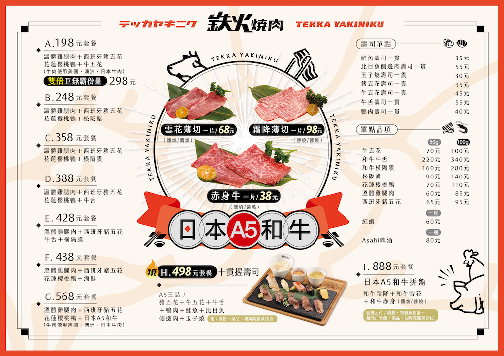 ▼『鉄火燒肉』接續母品牌樂軒大量採購和牛的優勢,霸氣推出史上最超值的價格回饋消費者,日本A5和牛每片只要38元起,採單片加點方式,適合品嚐完個人燒肉套餐之餘,視喜好或預算單點品享或嚐鮮。