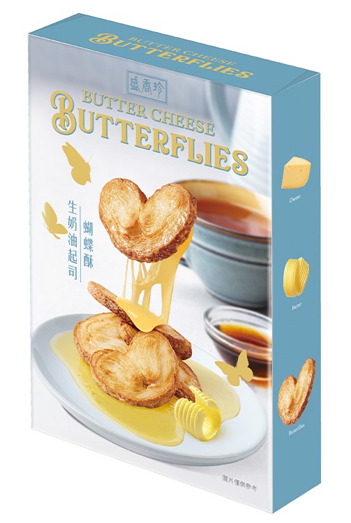 ▼「盛香珍生奶油起司蝴蝶酥」的蝴蝶酥餅體共96層,甜鹹口感豐富多層次,使用比利時天然奶油,並添加起司風味,共6小包。