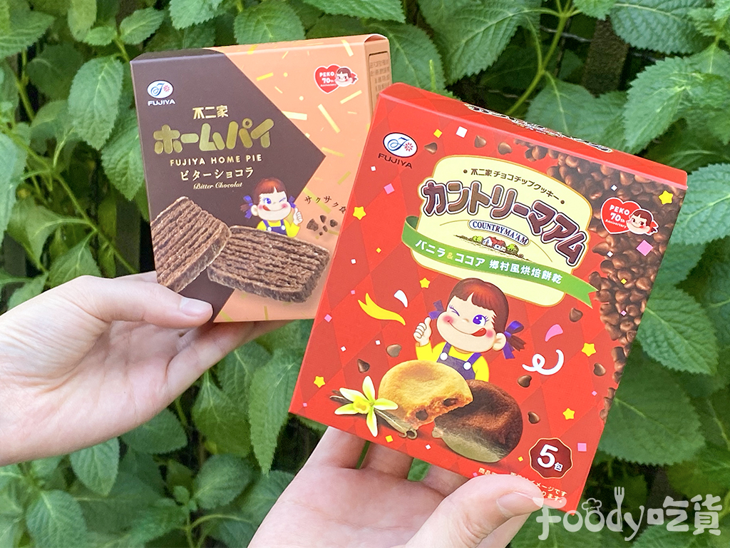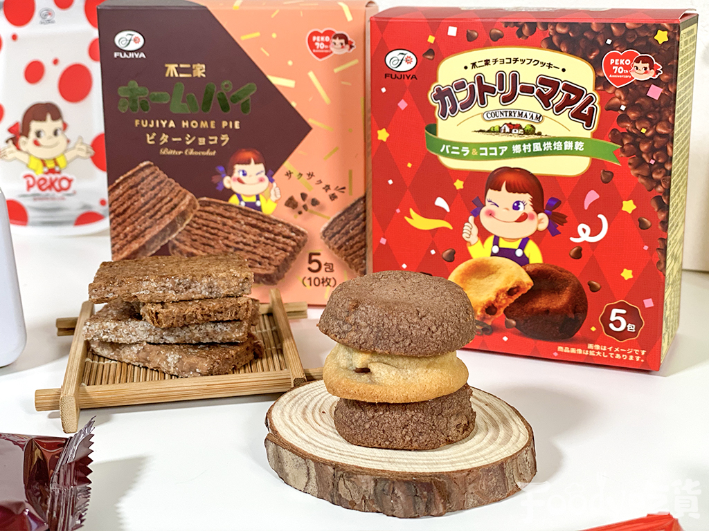 ▼「不二家Peko巧克力千層派」(售價59元),700多層餅乾堆疊烘烤而成,使用富士山天然水調製,餅乾鬆脆可口;「不二家Peko鄉村風烘焙餅乾」(售價59元),雙口味(香草/ 巧克力) 內含巧克力豆,外表酥脆內餡溼潤,口感如同現烤糕點,開封後加熱食用風味更佳。