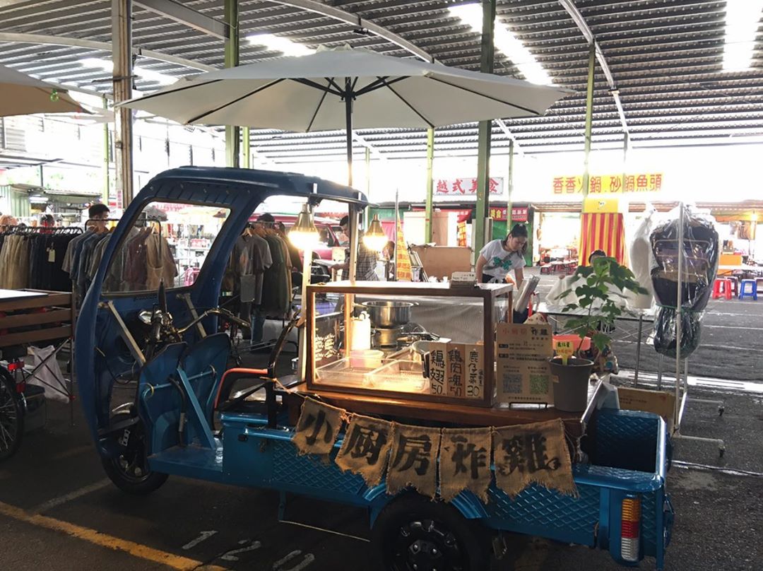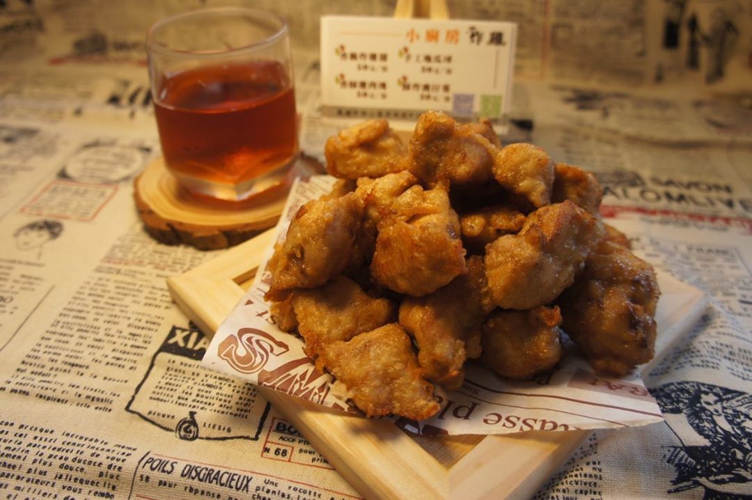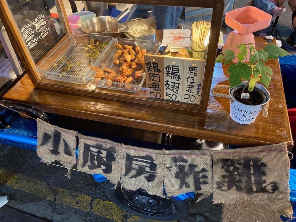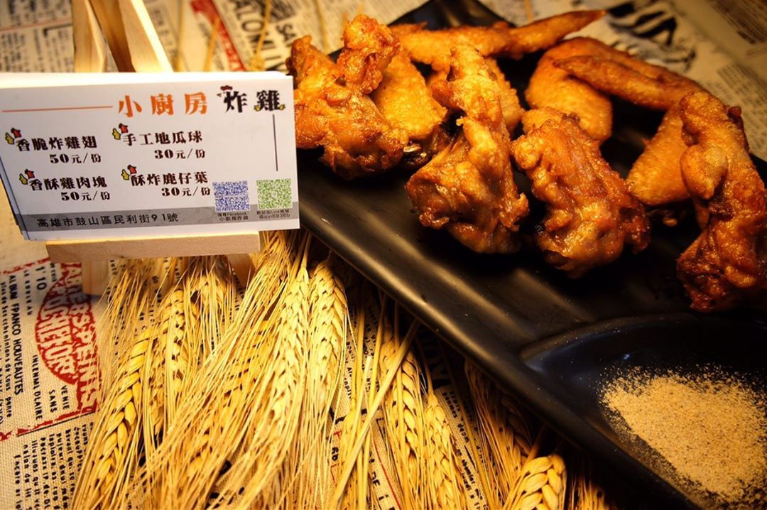 ▼位在高雄鼓山區的「小廚房炸雞」,就在道明外僑學校附近,木質攤車和暖黃燈,樸實又獨特的攤位經過時會忍不住多看一眼。店內主要販售四樣商品,分別是酥脆雞翅、地瓜球、香酥雞肉塊以及鹿仔葉。