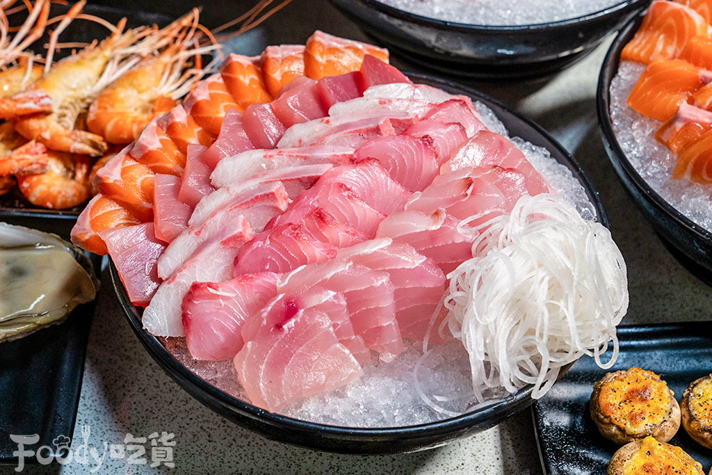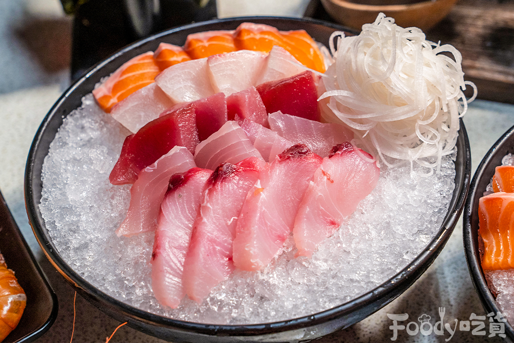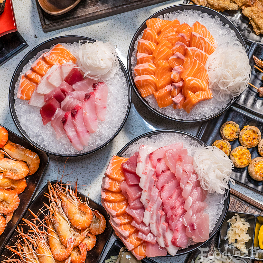 ▼一次享受海鱺、鮪魚、旗魚、鮭魚和鬼頭刀5種不同生魚片,肉質口感、香氣、鮮嫩與甜味各不相同超滿足;可別以為這麼便宜一定是「展現刀工」切得超薄,燒烤店的生魚片可是真材實料,不信你看看這堆生魚片每一片都是厚切型、份量完全不輸一般日料店、壽司店,根本和「薄」一點也沾不上邊,老闆真的有賺嗎XD?