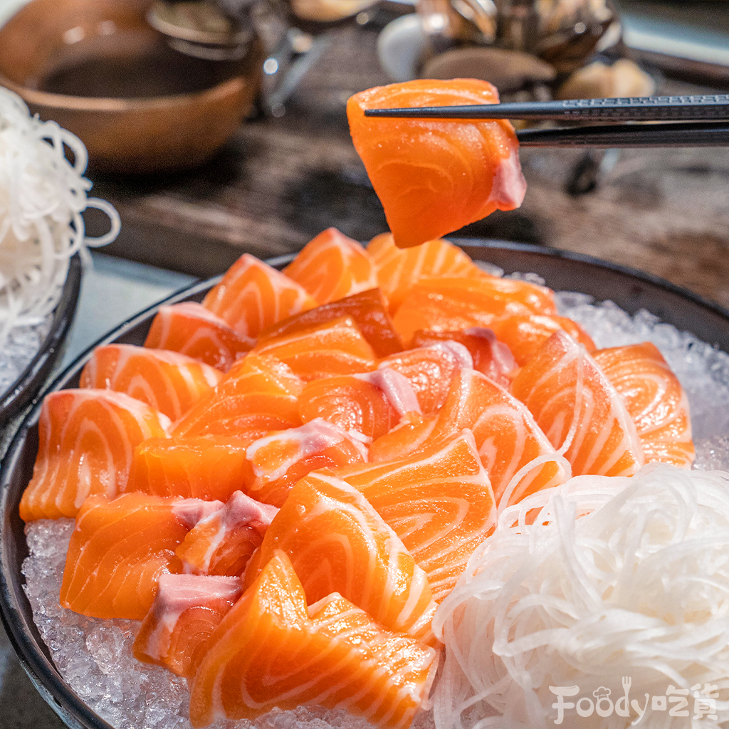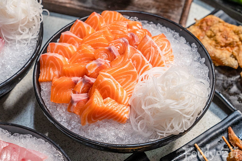▼喜歡鮭魚Q彈中帶軟嫩、充滿海產油脂鮮香口感的人,可以來一份全鮭魚生魚片(250元),看看這擺滿滿的嫩粉系橙色魚肉,鮭魚控一定凍未條~