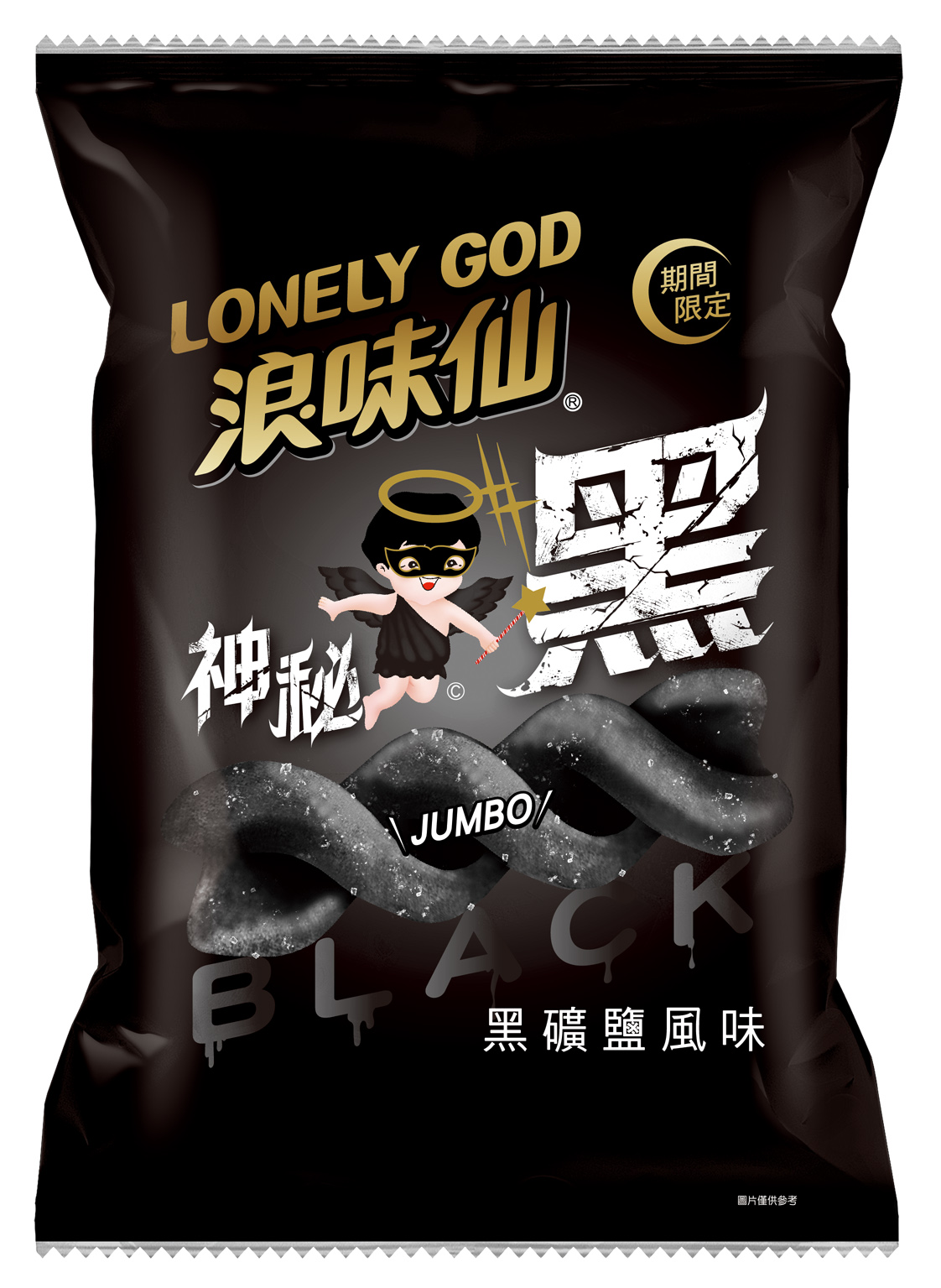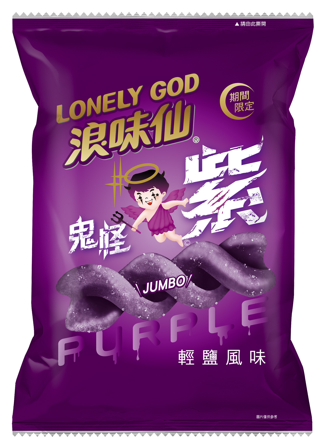 ▼「浪味仙洋芋捲-紫輕鹽風味、黑礦鹽風味」(NT$ 30)萬聖節版神秘妖怪,輕鹽口味全新風味,經典螺旋加大20%,浪你無法抗拒!紫輕鹽:紫色螺旋餅體,酥香爽脆;黑礦鹽:黑色螺旋餅體,裏上礦鹽酥香爽脆。
