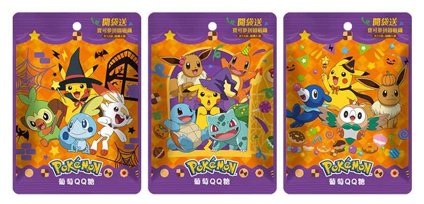 ▼「寶可夢葡萄QQ糖」(NT$ 49),寶可夢軟糖第3彈,全新葡萄QQ軟糖,酸甜Q彈有嚼勁,內附隨機寶可夢磁鐵,共12款磁鐵,可拼出2片完整拼圖,快來蒐集吧!