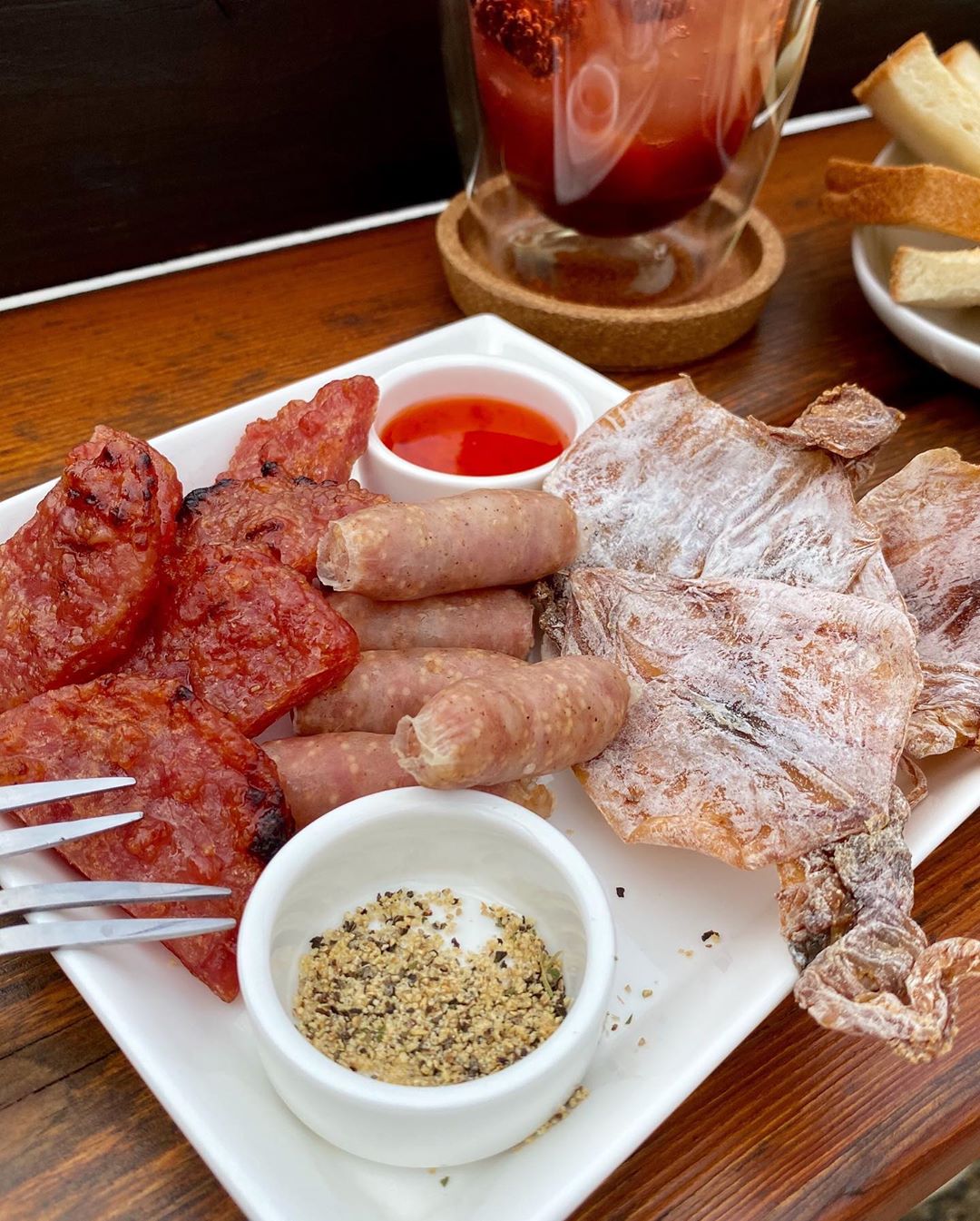 ▼這裡有販售滿滿海味的「三味拼盤」(NT$ 180),飛魚卵香腸、飛魚卵肉乾再配上烤小卷乾,視覺、味覺都沈浸在大海的魅力裡!