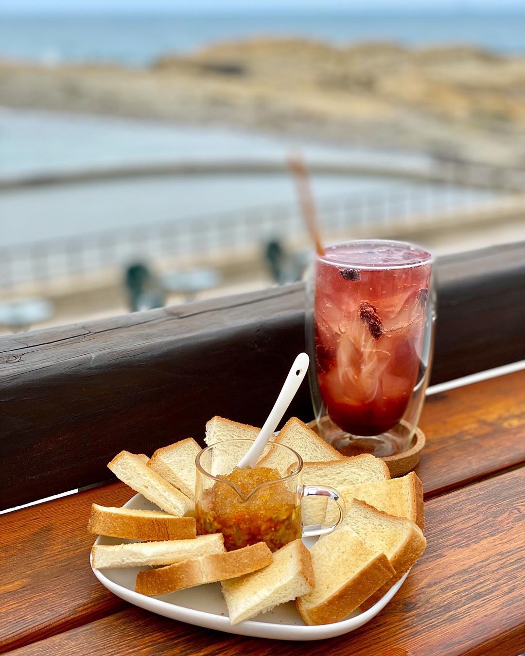 ▼另外還有「飛魚卵莎莎醬+烤吐司」(NT$ 135),現烤的吐司切塊擺盤,中間放上一杯金黃色澤的飛魚卵莎莎醬,微辣的飛魚卵莎莎醬沾一點點就很夠味,配上吐司一起吃簡直絕配!來到海邊當然少不了來杯石花凍,這杯「石花凍蔓越莓氣泡飲」(NT$ 140)將基隆特產石花凍搭配清爽的蔓越梅氣泡飲,酸酸甜甜的滋味超解暑!