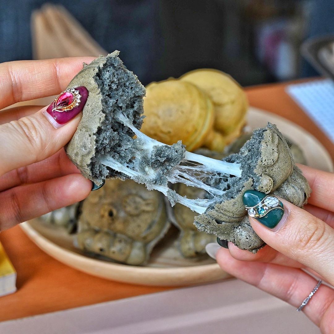 ▼除了造型超古錐之外,還有多種內餡口味可以選,像是拔絲乳酪、可可、香濃奶油及鮪魚等等,只要加購10元,就可以升級加內餡!咬一口雞蛋糕,內餡口感絲滑香濃,乳酪還可以拉出長長的牽絲,實在是太欠吃!
