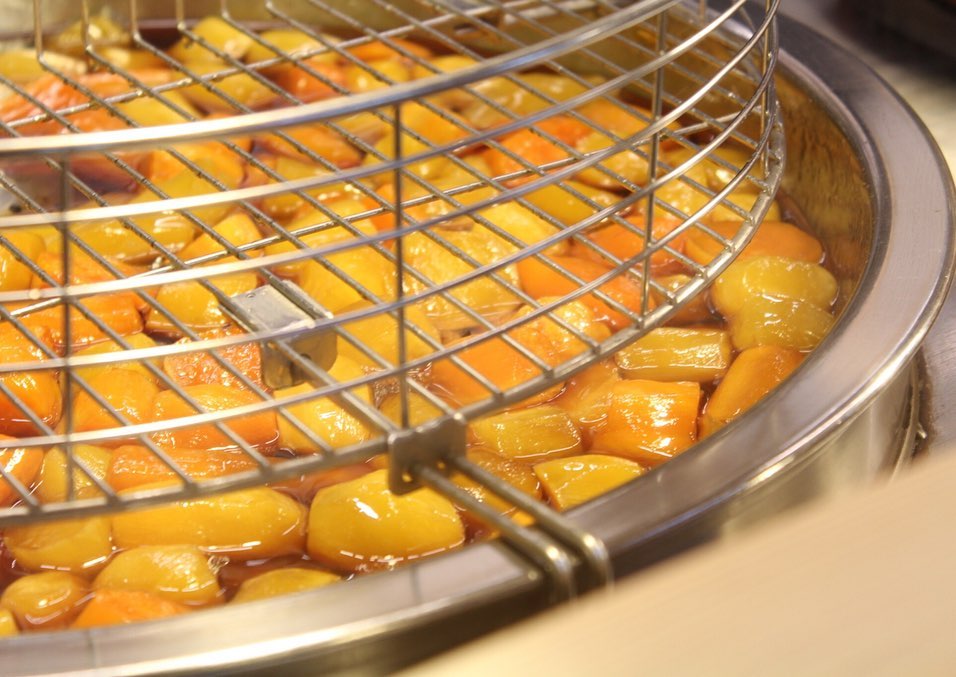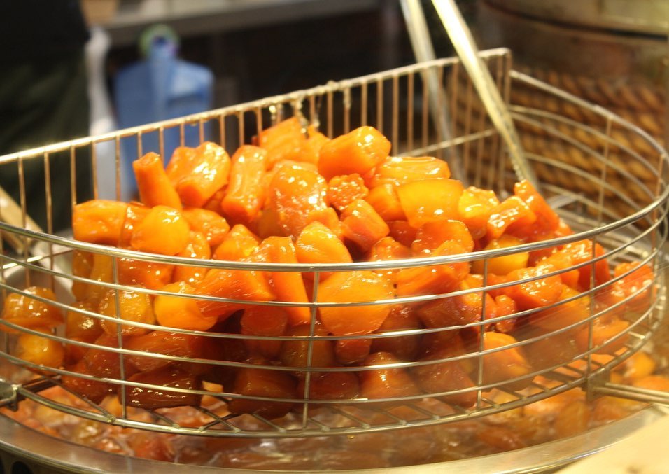 ▼看看這一大鍋亮晶晶的蜜地瓜,在鍋裡翻滾,每一顆地瓜都裹上厚厚的糖衣,一口咬下去,軟軟綿綿的地瓜香甜可口,麥芽糖和地瓜完美融合在一起!
