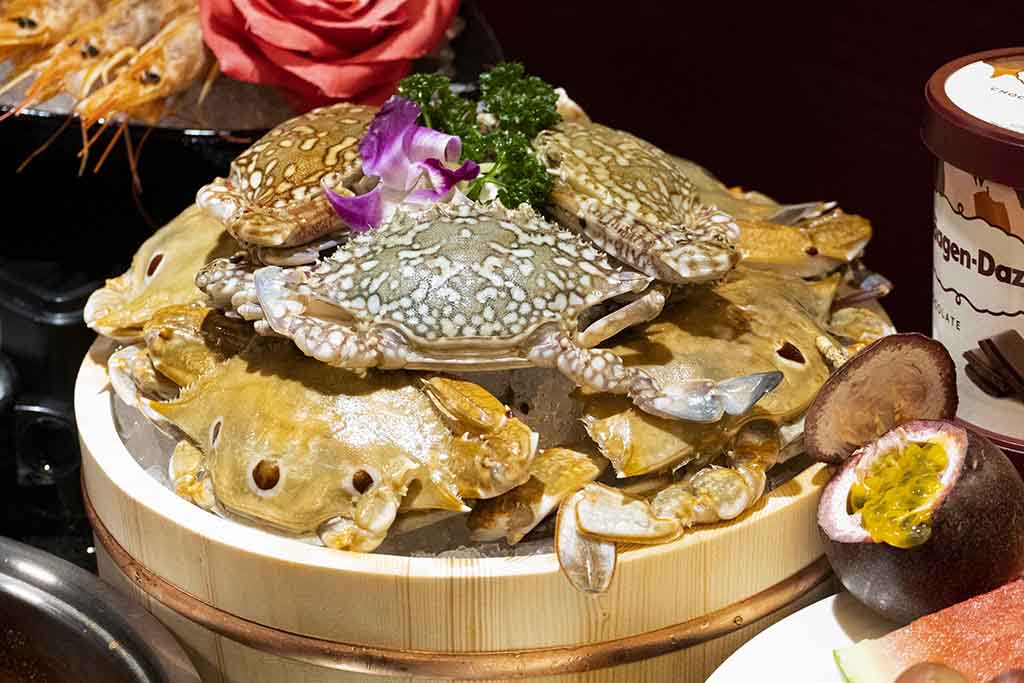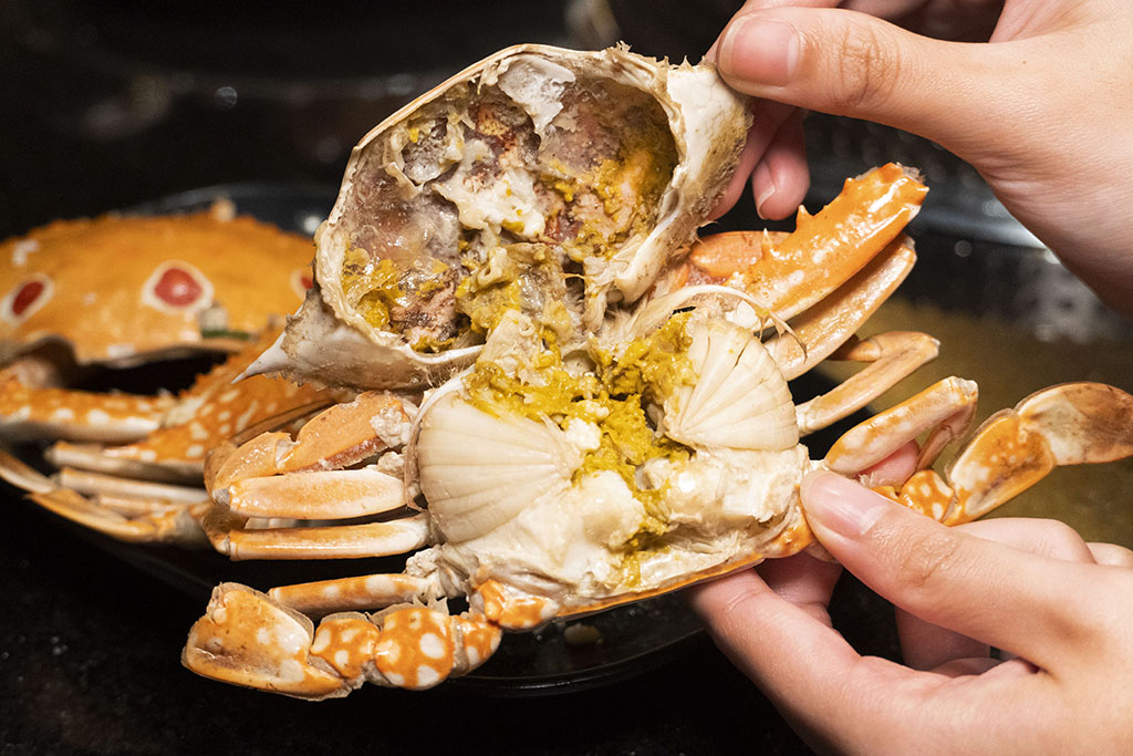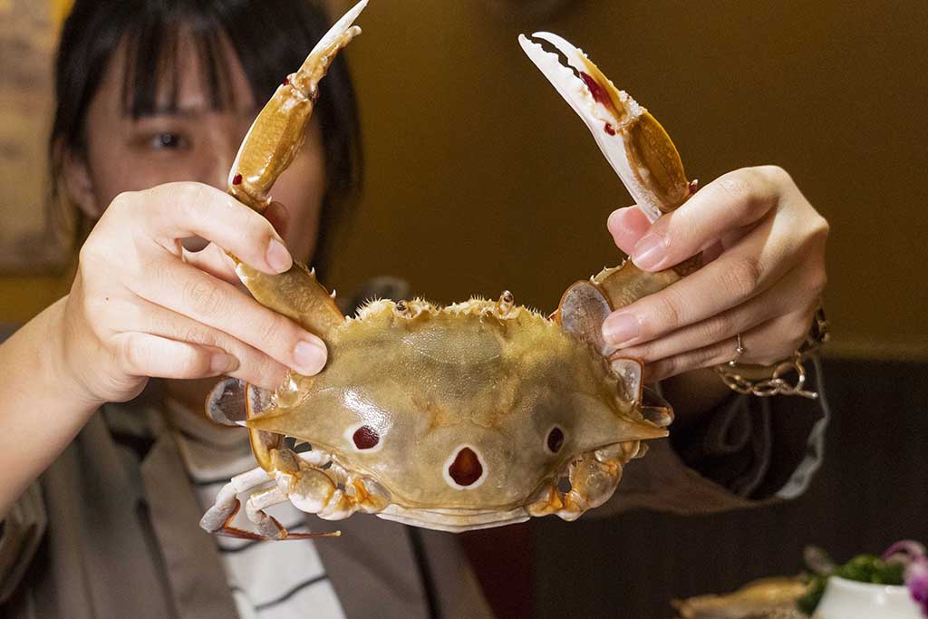 ▼而秋季蝦、蟹肥美,店內供應野生草蝦、鮮甜白蝦,還有肉質鮮甜、一直以來都超高人氣的「三點蟹」之外,本次還限量推出進口的「頂級藍鑽蟹」,來滿足饕客!藍鑽蟹外觀呈青褐色、殼薄好剝,肉質絲絲細緻,帶有自然海水鹹味與螃蟹的甘甜,正值時節,還有機會碰上濃厚肥滿的蟹膏。
