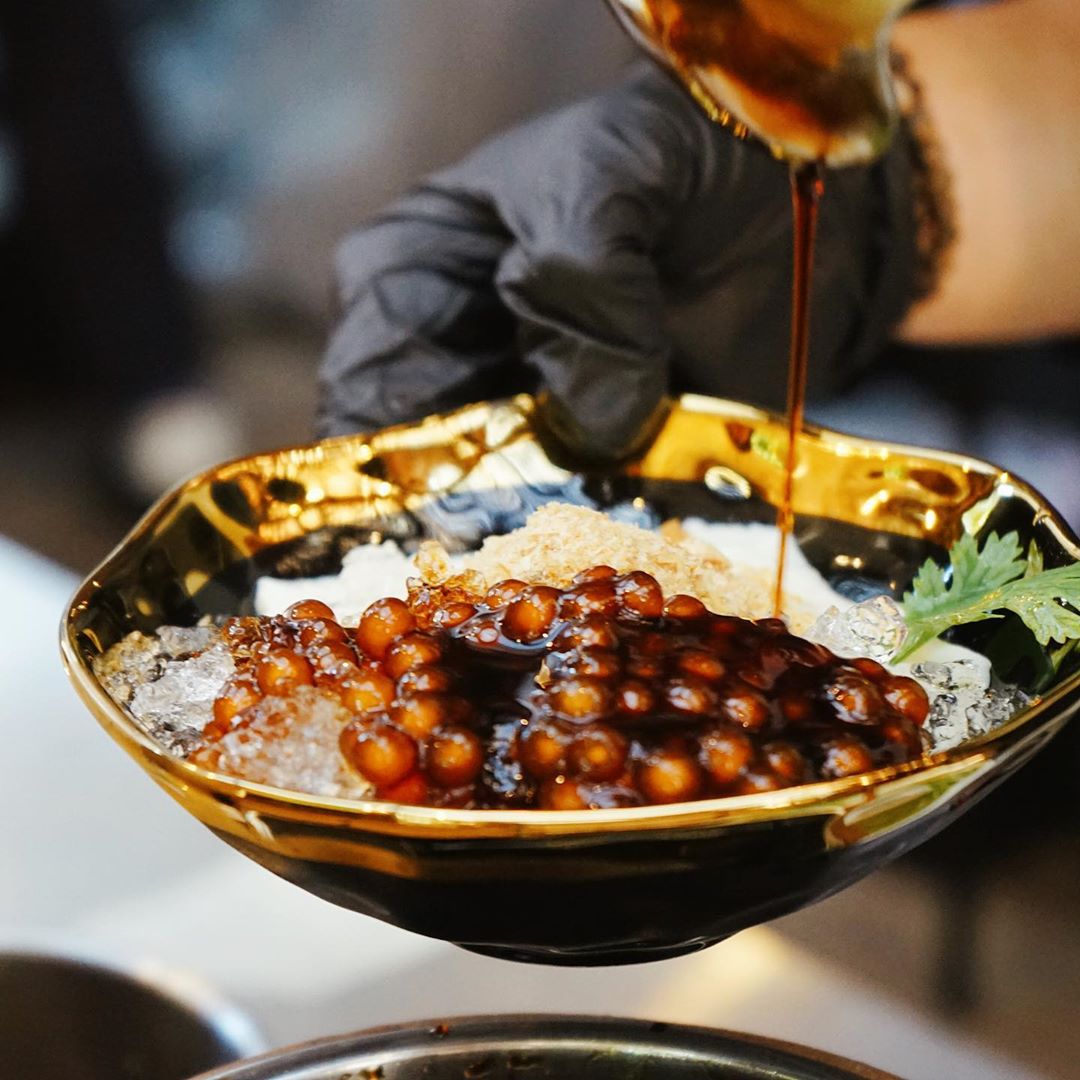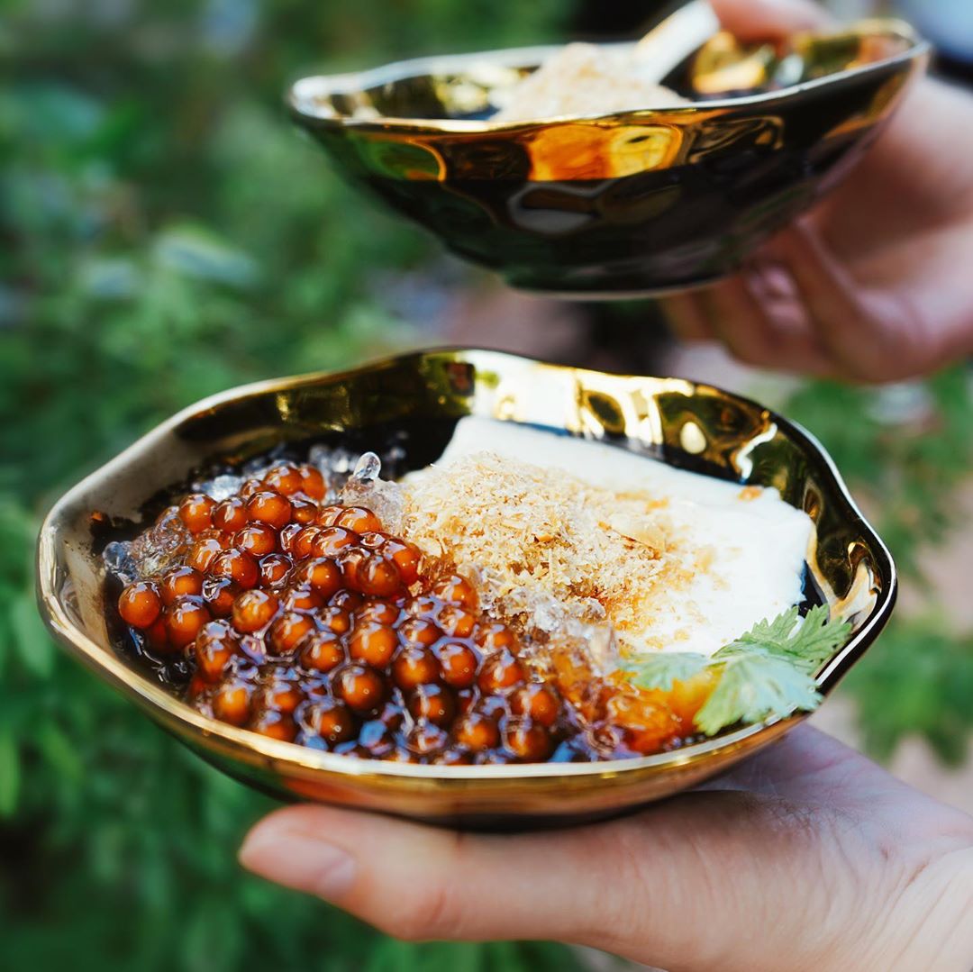 ▼美味豆花尬上「麥芽糖花生」為基底口味,加入不會過甜過膩的黑糖水,也能選擇加料粉圓、桃膠增添QQ口感;金邊黑碗中裝著琥珀色桃膠、粉圓,一片香菜襯托白嫩豆花,好拍又好吃的豆花就是這一碗!