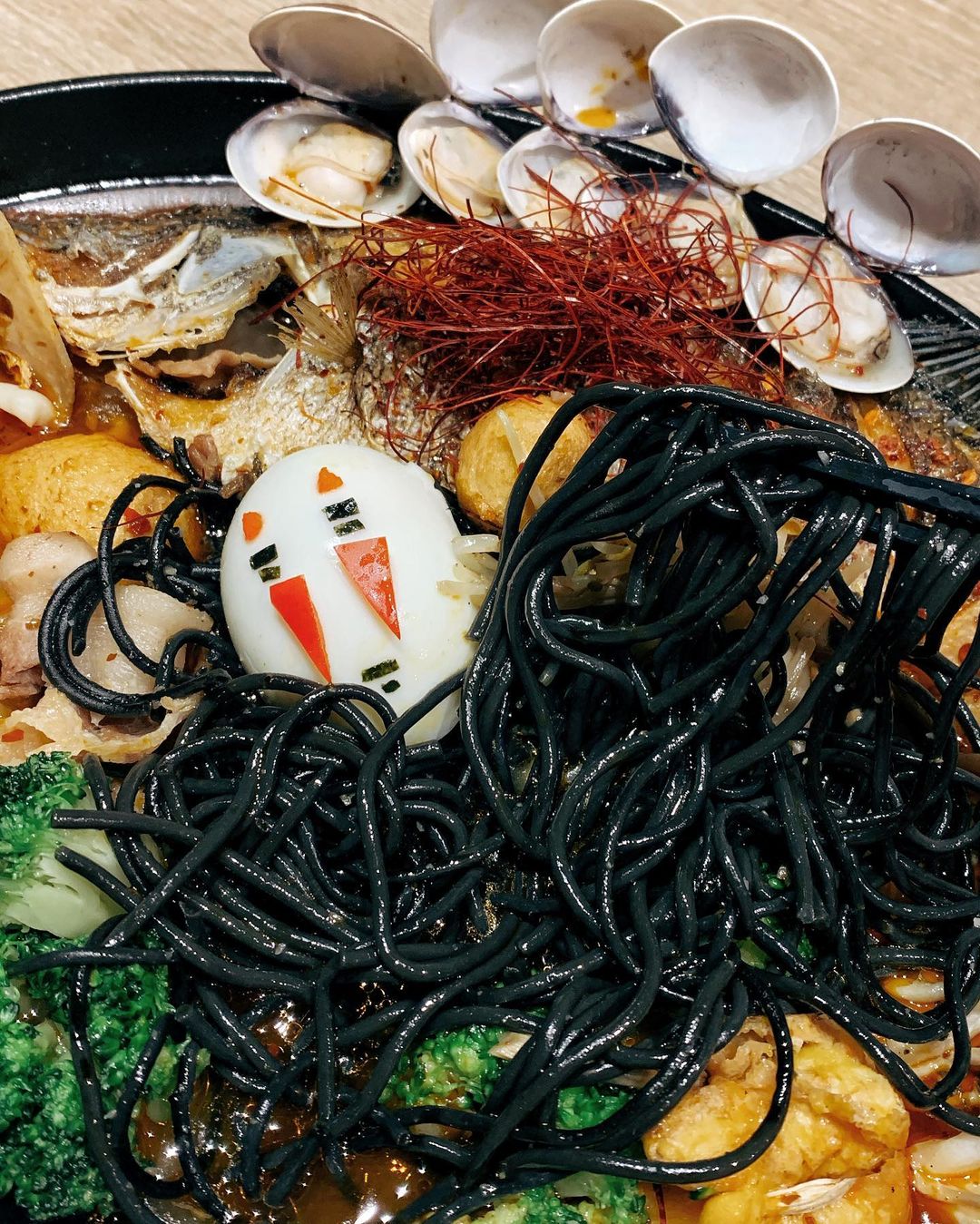 ▼首先要來介紹的就是這款「好咖咖啡」萬聖節限定推出的主菜,這份「湯婆婆的豪華御宴」將小火慢燉麻辣湯中用了整尾鱸魚入菜,接著加入辣炒墨魚義大利麵、新鮮蛤蜊、豬五花、綜合菇類和魚卵福袋,整份餐點相當澎湃~
