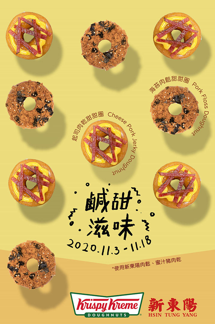 2020年11月02日當肉乾遇上甜甜圈,蹦出甜鹹新滋味,你一定要嘗嘗看!Krispy Kreme和「新東陽」首次聯名推出「海苔肉鬆甜甜圈」以及「起司肉乾甜甜圈」。超豐富的口感,這麼神奇的口味,喜歡肉乾的朋友一定不能放過!