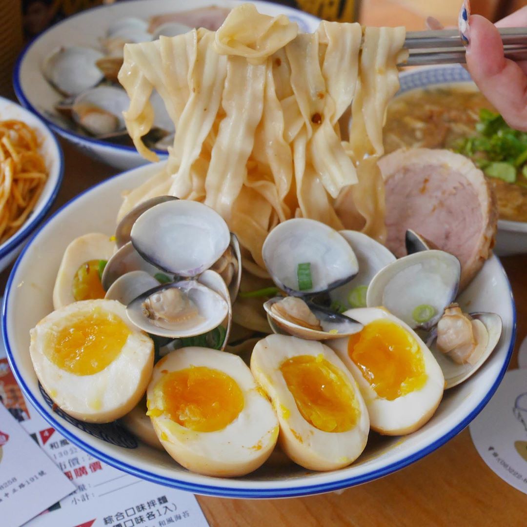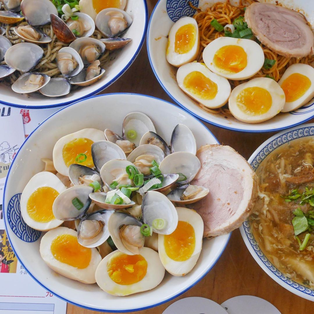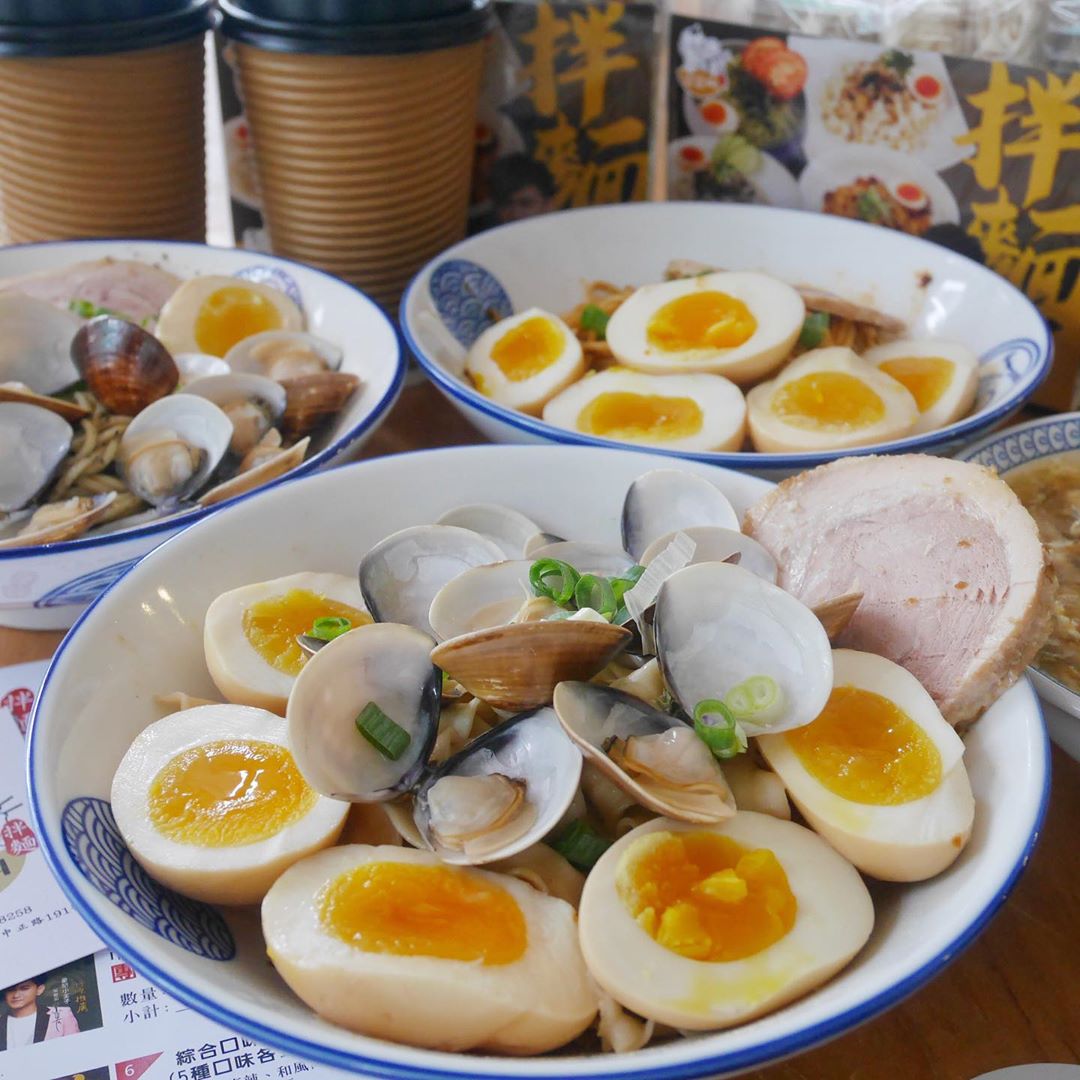▼想要吃得更豐富一點,還可以加點「滿蛋全席」(NT$ 40),直接在拌麵上加兩顆切開的溏心蛋,光是這樣就可以讓拌麵看起來更美味,如果還想加點海味的話,那就一定要點「蛤滿盆」(NT$ 40)飽滿的蛤蠣擺好擺滿,這麼澎湃的拌麵怎麼能不來吃吃看呢!