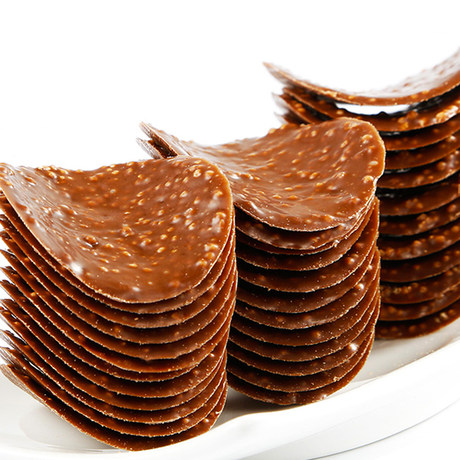 ▼不同於別的品牌一般是在洋芋片外層包裹巧克力,HAMLET這款是直接用巧克力塑形成洋芋片造型,雖然沒有真的洋芋片,但是由於加入了脆米果,整體口感也是像洋芋片一樣卡滋卡滋炒有Fu~愛吃巧克力的巧克力控們,可以充分享受巧克力的濃濃甜香,也能同時享受酥酥脆脆的脆米果口感,一拆開就忍不住一片接一片,停不下來啦~