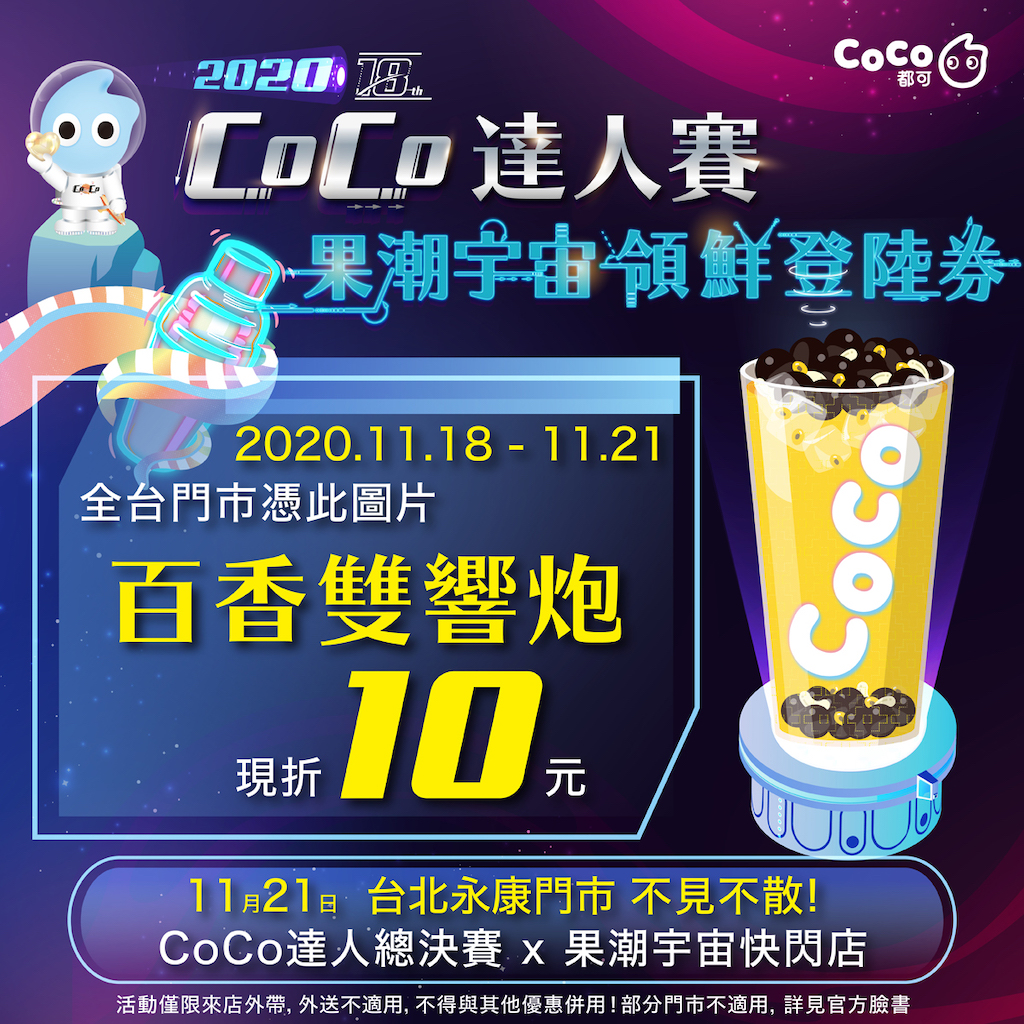 ▼此外,只要在11/18-11/21期間到全台CoCo都可門市,結帳時出示此圖片,即可享「百香雙響炮」現折10元(商場門市/離島門市/北車/南港展覽館/部分門市不配合),喜歡喝「百香雙響炮」的朋友,這張照片先存起來!
