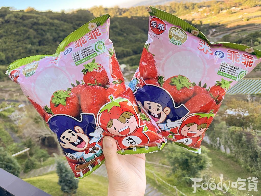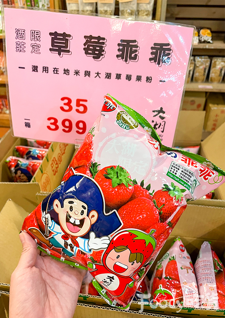 ▼這包「大湖草莓米乖乖」其實過去幾年就早已推出,不過每年草莓季當然是要來回味一下的~跟一般的草莓米乖乖、草莓彎脆果可都不一樣,除了本身是用米做的之外,更是使用大湖農會草莓製作而成的草莓粉,結合在地新鮮食材,是大湖酒莊限定販售的商品!