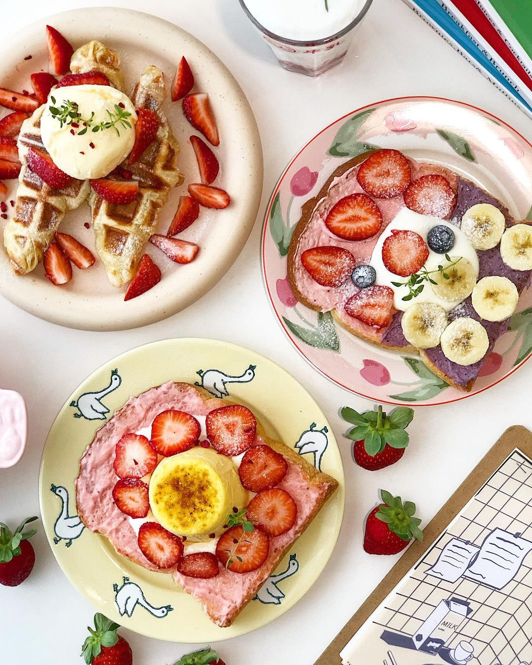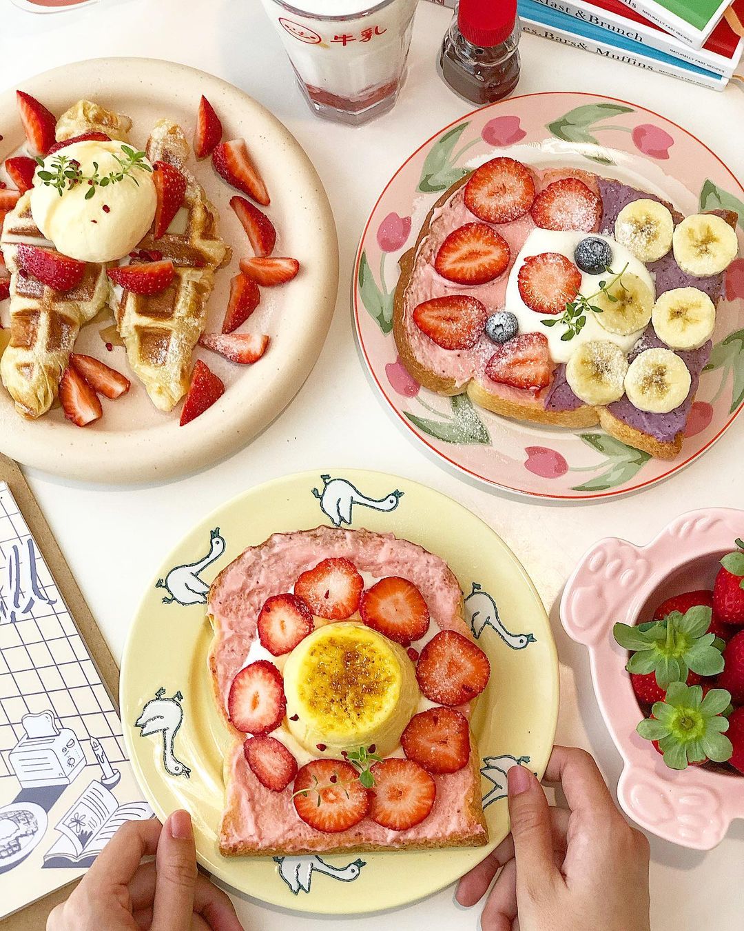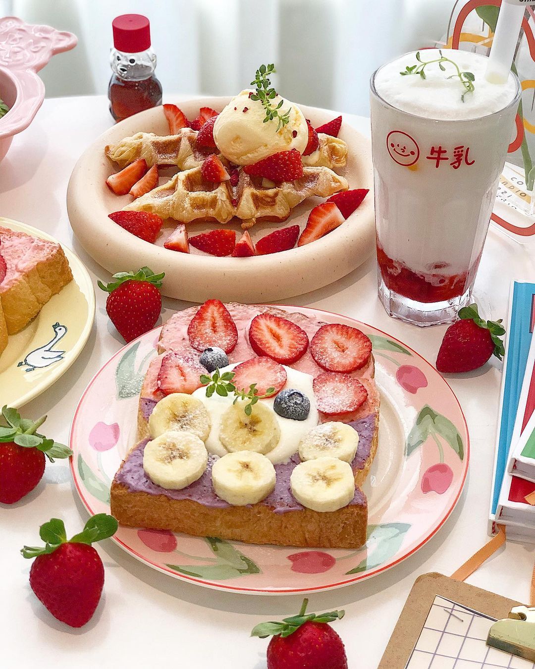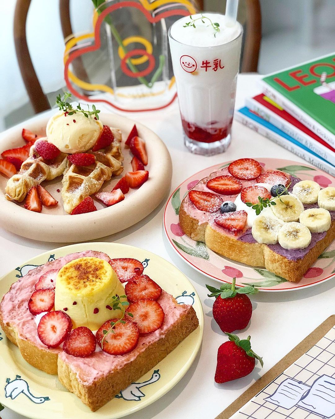 💰草莓蜜糖冰淇淋可頌鬆餅$259、雙色莓果乳酪吐司$140、草莓乳酪布蕾吐司$150、草莓牛奶$120