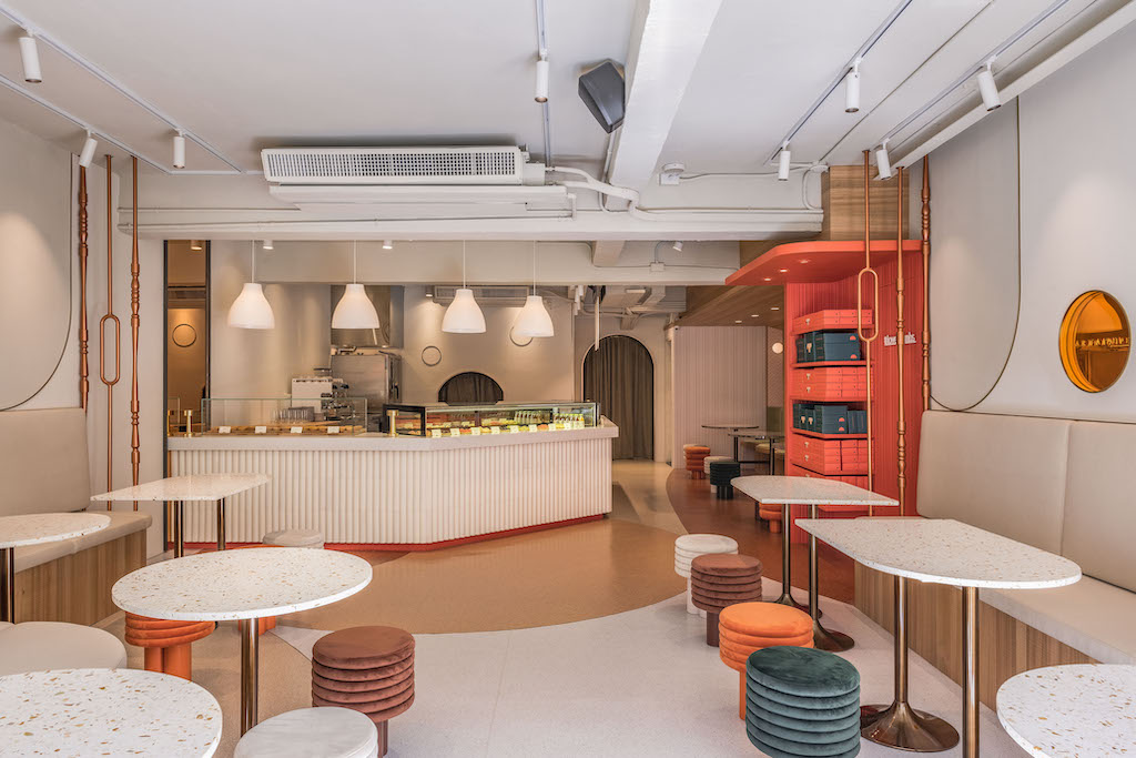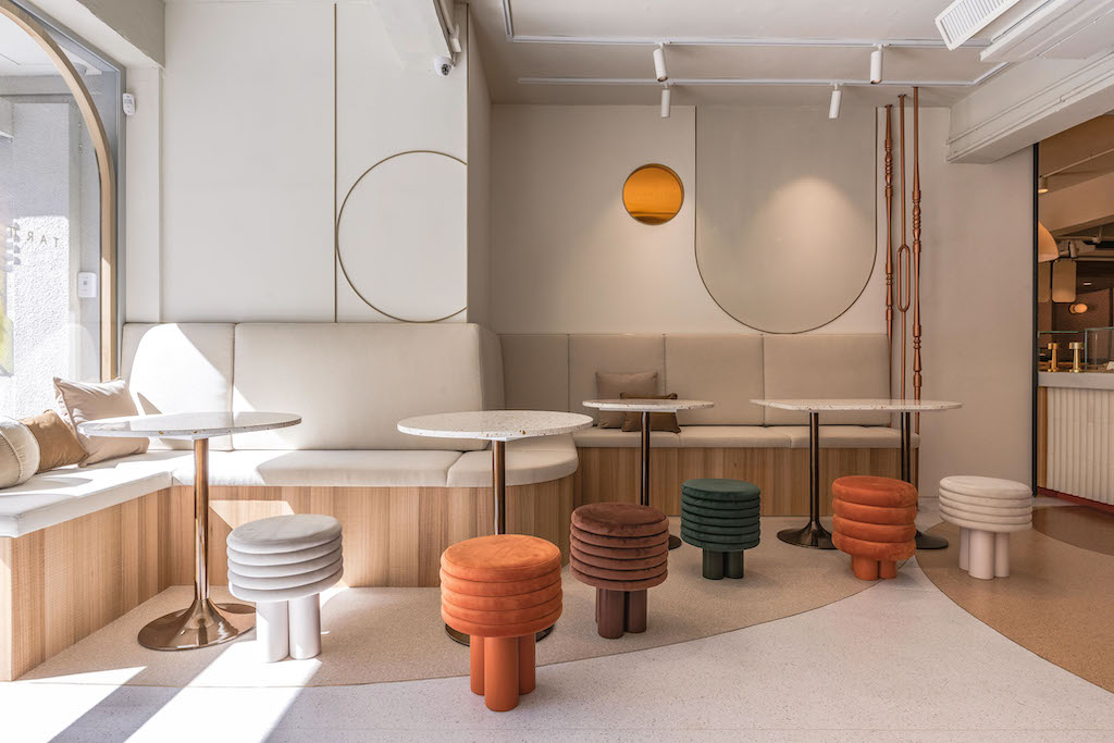▼TART TAIPEI整體空間靈感來自圓形蛋塔,延續包裝的艷陽橘與墨綠,利用品牌橘色系透明壓克力,與各式圓型、弧型演繹90年代摩登趣味普普風,並結合彎曲線條與充滿趣味感的訂製造型椅,呈現甜點店的可愛柔美意象,無論是來店享用下午茶、或購買酥塔作為伴手禮,皆可為生活增添甜蜜的儀式感。