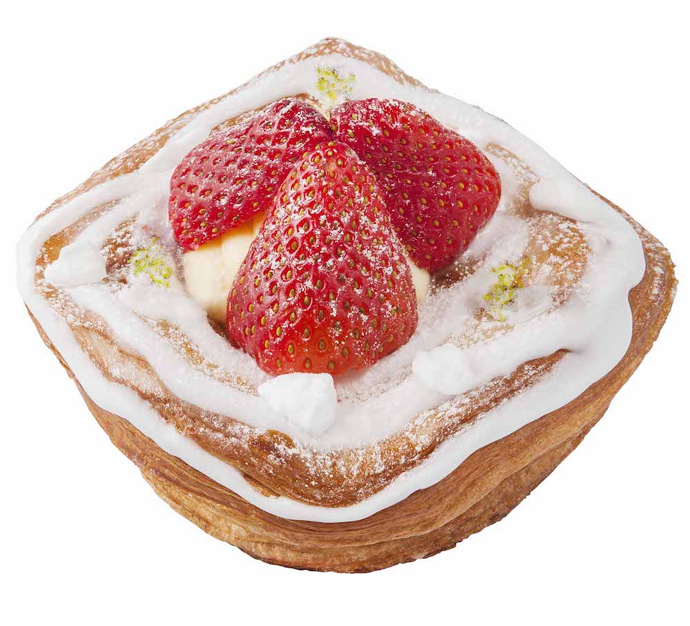 ▼「草莓卡士達」(NT$69)採用天然香草籽襯托濃郁奶香的草莓卡士達醬填入經典蜂巢可頌,雪白糖霜與渾圓飽滿又多汁的草莓完美共舞,快與我們來場甜蜜約會吧!