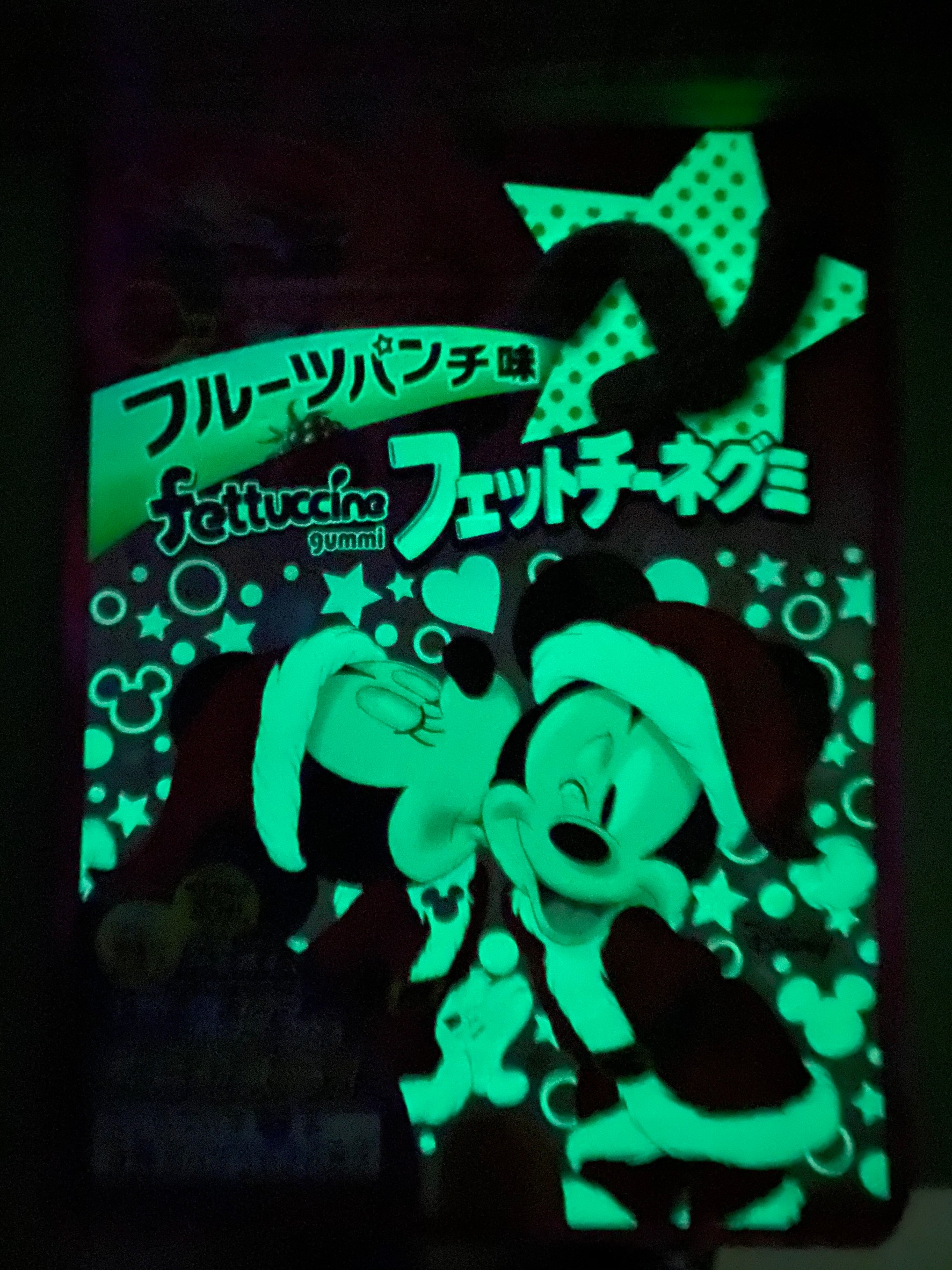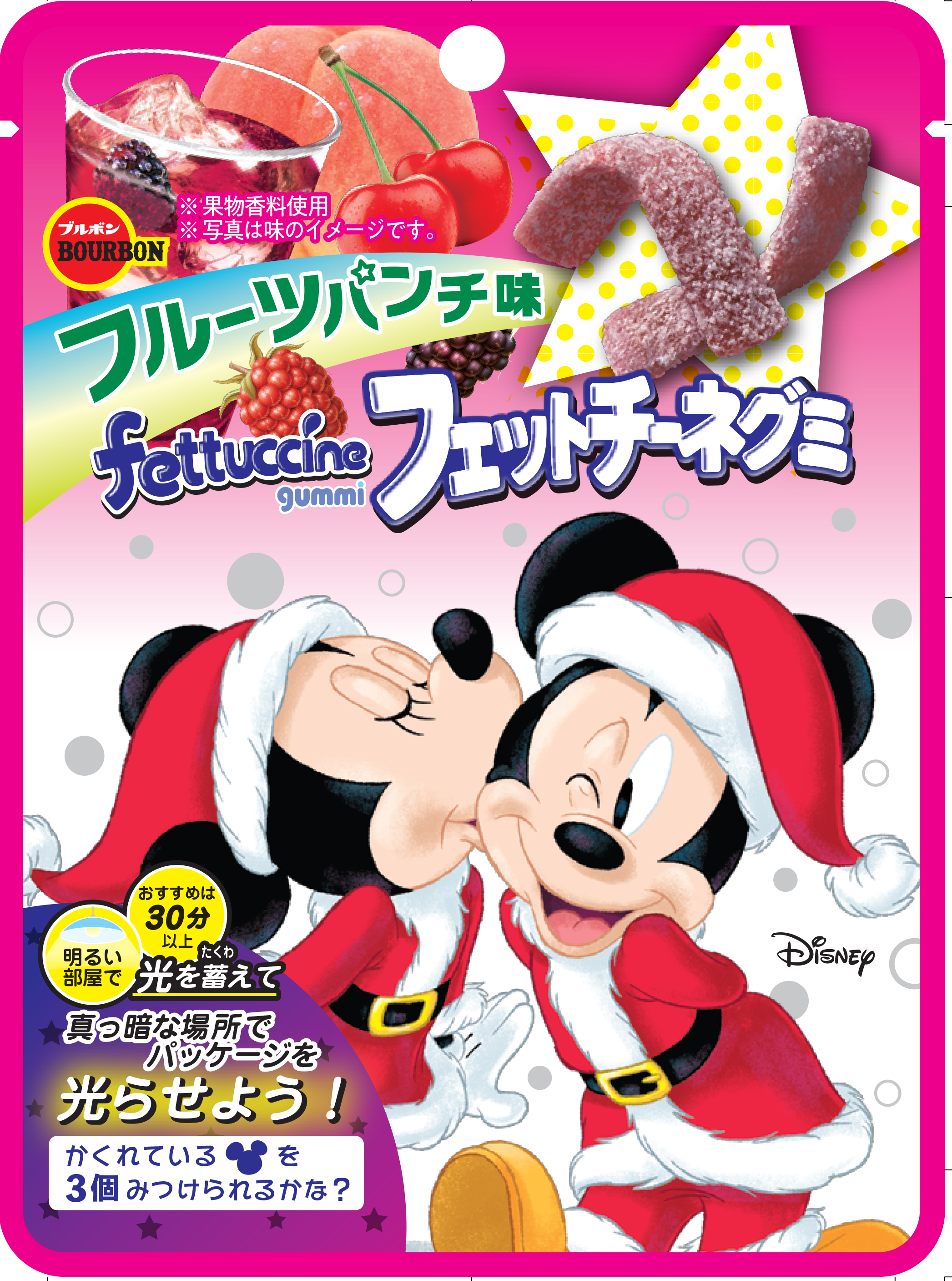 ▼今年迪士尼還與日本Bourbon出了聖誕聯名版,除了水果軟糖好可口,還用了特別技術「蓄光印刷」,讓已在黑暗中也能看近米奇米妮的身影,米奇給米妮一個吻在黑暗中真的是閃翻眾人!