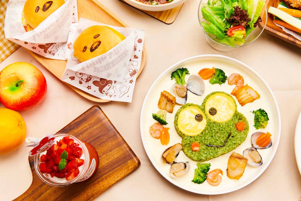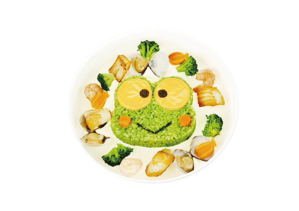 ▼「大眼蛙奶油海鮮青醬燉飯」高人氣大眼蛙造型,由新鮮菠菜製成的燉飯,搭配奶油白醬,每一口都能吃到菠菜的營養,即使是愛挑食的小朋友也不抗拒,營養均衡又不失風味!