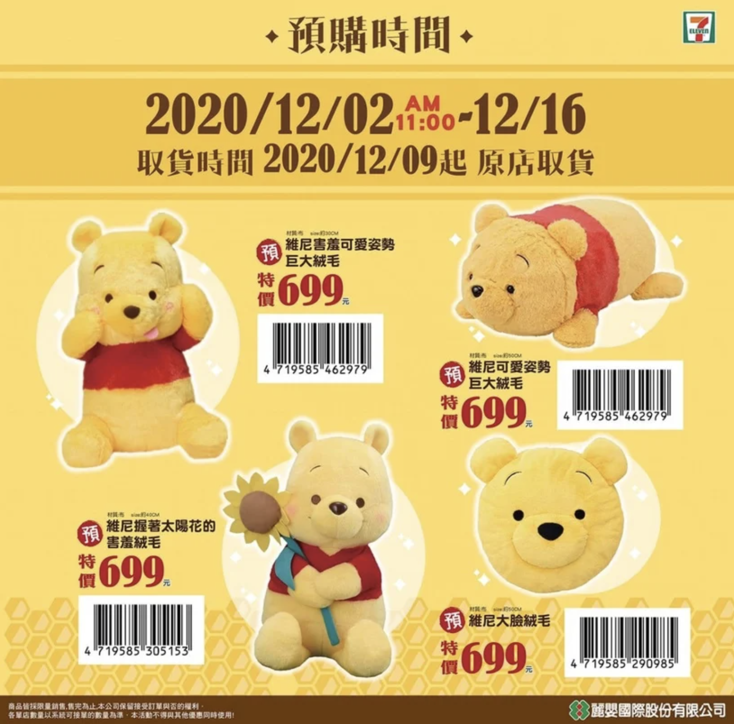 【全台】是最Q的維尼! 7-11「小熊維尼預購」軟萌登場 4款「巨大絨毛玩偶」必須抱緊處理