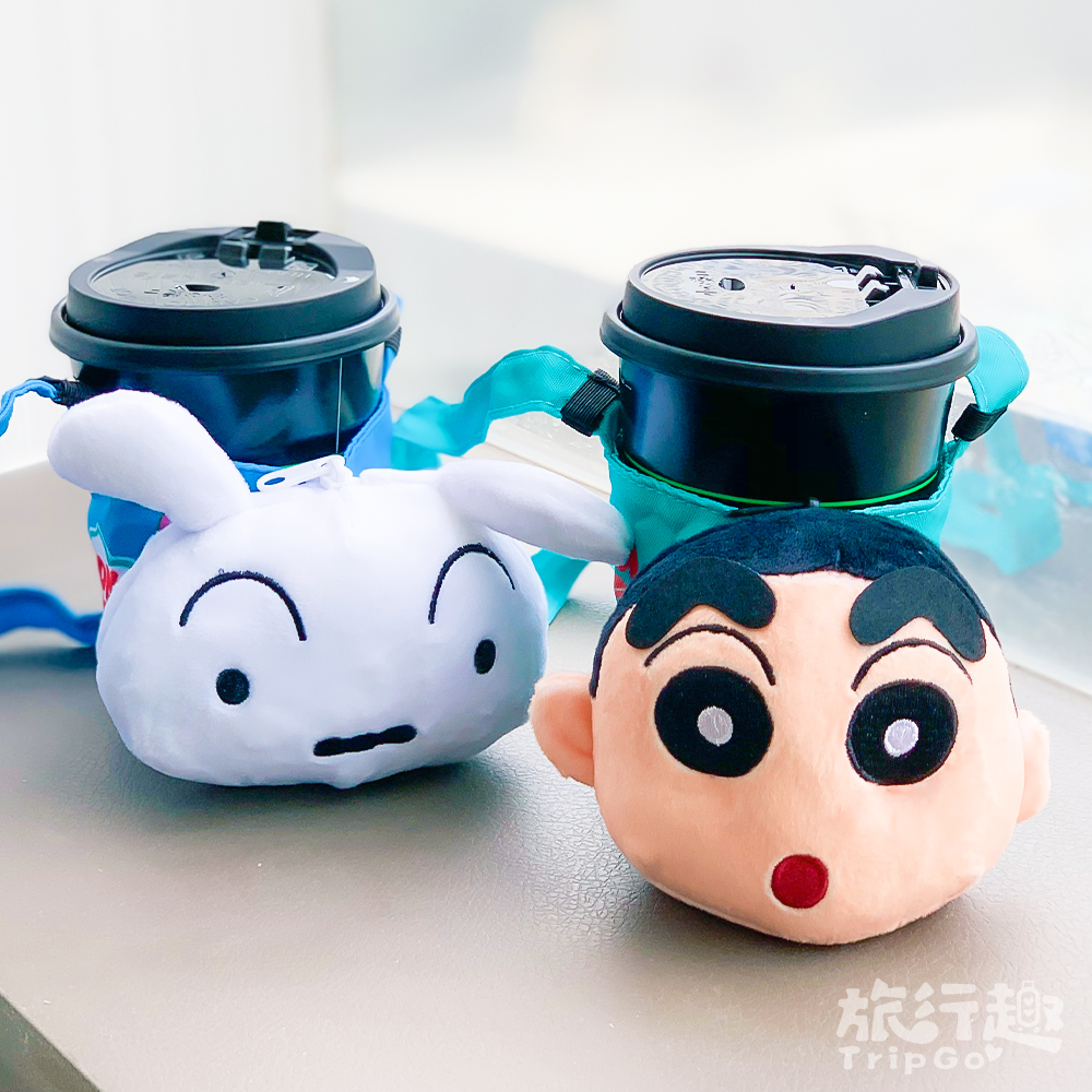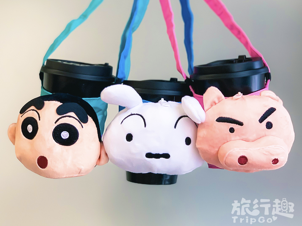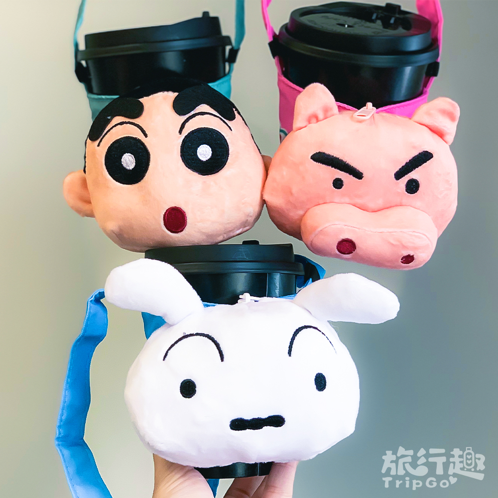 ▼蠟筆小新絨毛玩偶造型飲料提袋:響應環保也可以療癒又可愛,絨毛大頭在杯提上古錐到不行,捏起來手感也是超蘇湖~