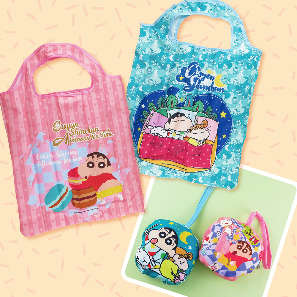 ▼蠟筆小新環保購物袋:小新吃點心的可愛午茶風「馬卡龍屁屁款」,以及黑夜降臨後和妹妹小葵、小白一起睏覺的「呼呼大睡款」圖案,響應減塑古錐又實用。