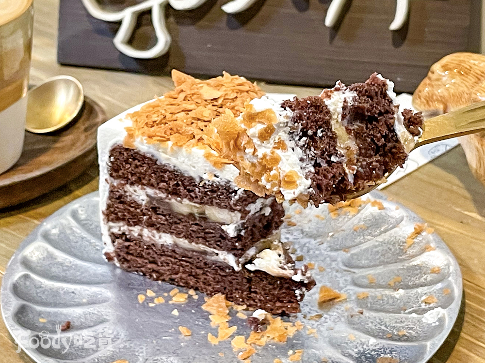 ▼店內主推手作蛋糕、咖啡、抹茶等等,像是這道「香蕉巧克力鮮奶油蛋糕」(NT$ 150)巧克力鮮奶油蛋糕中,夾著香蕉切片藏在內餡裡,搭配頂端香脆的脆片一起吃,口感層次豐富,巧克力和香蕉這組合完全不會錯!
