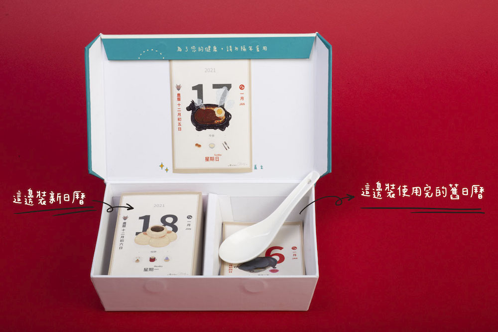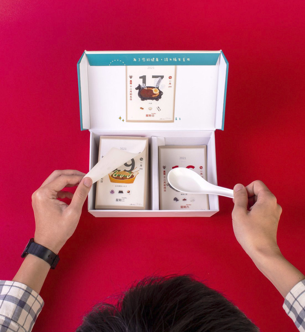 ▼日曆的包裝是以最具代表台灣庶民美食包裝象徵的「便當盒」作為設計。便當盒為手工量身訂做,雖然看起來很簡單,但為了兼顧展示與收藏的功能,每個角度、尺寸都是經過精心設計與測試,並特別選用了禮盒規格的材質與厚度,在經過數不清的設計修改與製程更新,不但保留在地便當的外觀,更提升精緻程度!