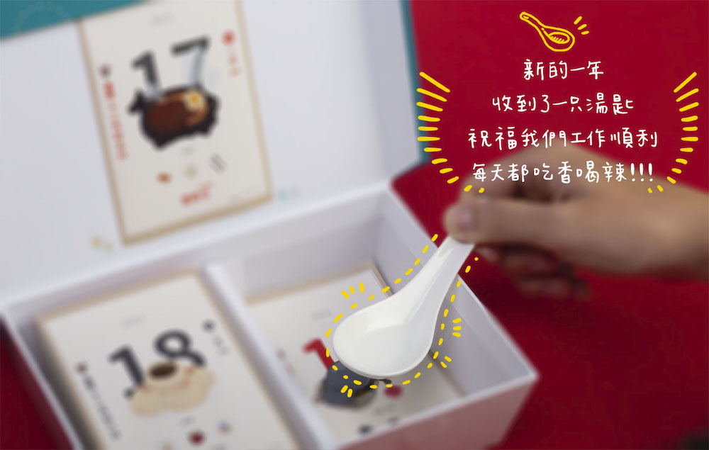在新的一年,如果收到了一隻湯匙,就代表著祝福收到的人"工作順利",每天都能夠吃飽飽的象徵唷~也能和便當的形象互相搭配,做為舊日曆收藏的紙鎮來使用,當然,要是吃飯忘了準備餐具,還可以派上用場!