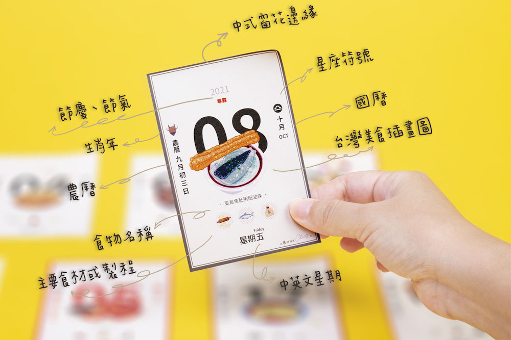 ▼日曆總共365張美食插畫對應中西方年曆月份、生肖年、星期、二十四節氣、時令與各節日習俗、十二月星座,及其主要食材或製程,每一天皆展現出台灣人對於節日生活搭配飲食文化的重視!除此之外台灣美食日曆希望與使用者有趣互動,提供『翻到什麼吃什麼的建議』!解決『每天吃什麼的煩惱』,讓每一天的飲食都變成有意義的一天,兼顧實用與趣味!