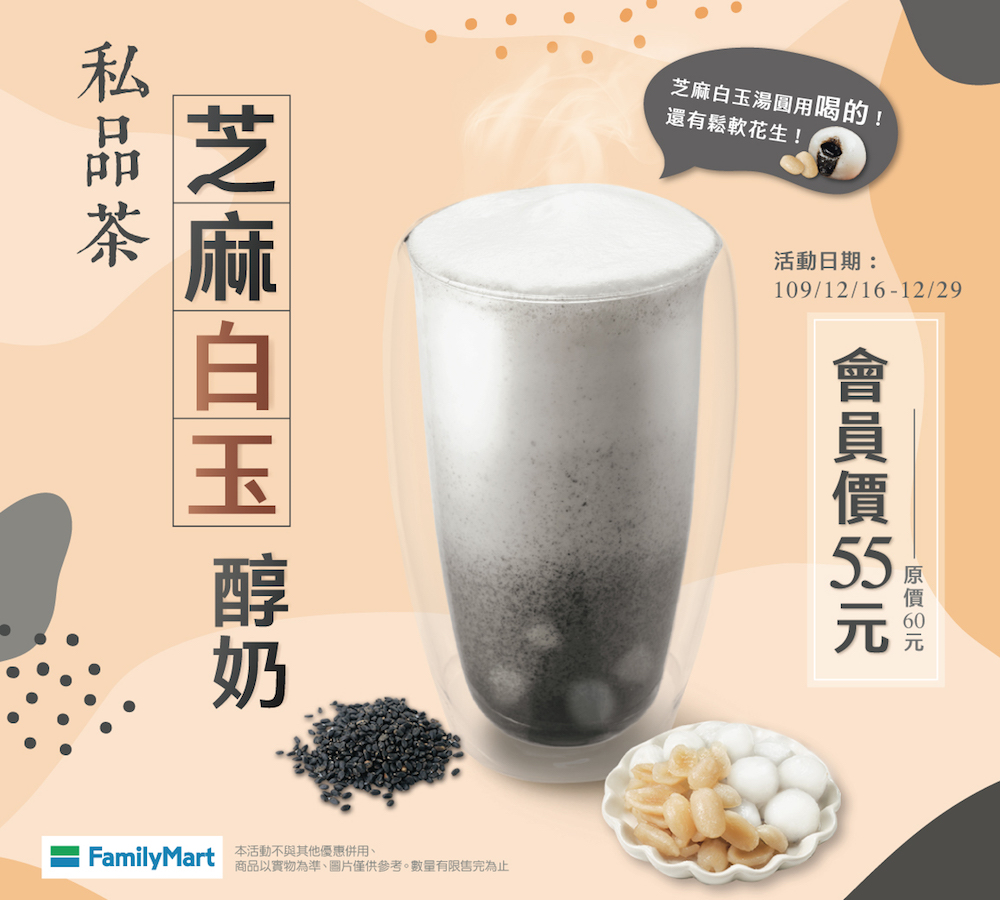 ▼「芝麻白玉醇奶」限量20萬杯、每杯售價60元,即日起至12/29凡全家會員購買,特價55元。